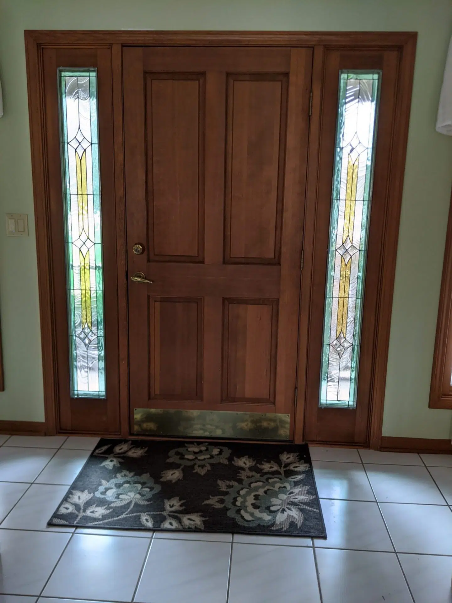 Our client wanted to give his entrance a new look, he used our Simple & Elegant!! The “Mountain View” Stained and Beveled Glass Window for the Sidelights with an added touch of color. For the Octagon Window, he used our Magnificent! “The Hermosa” Octagon Stained Glass with matching colors to give a Classic Mission / Craftsman Style to the entryway.