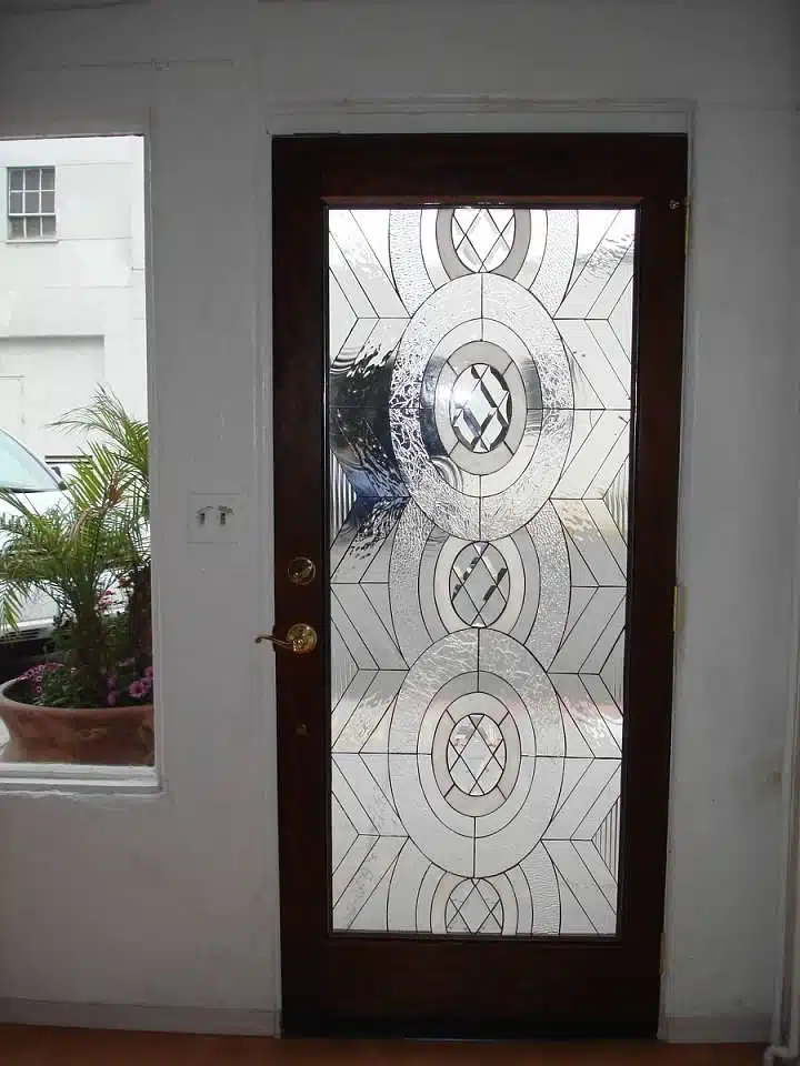Elegant clear and beveled stained glass, custom installed on doors and transoms