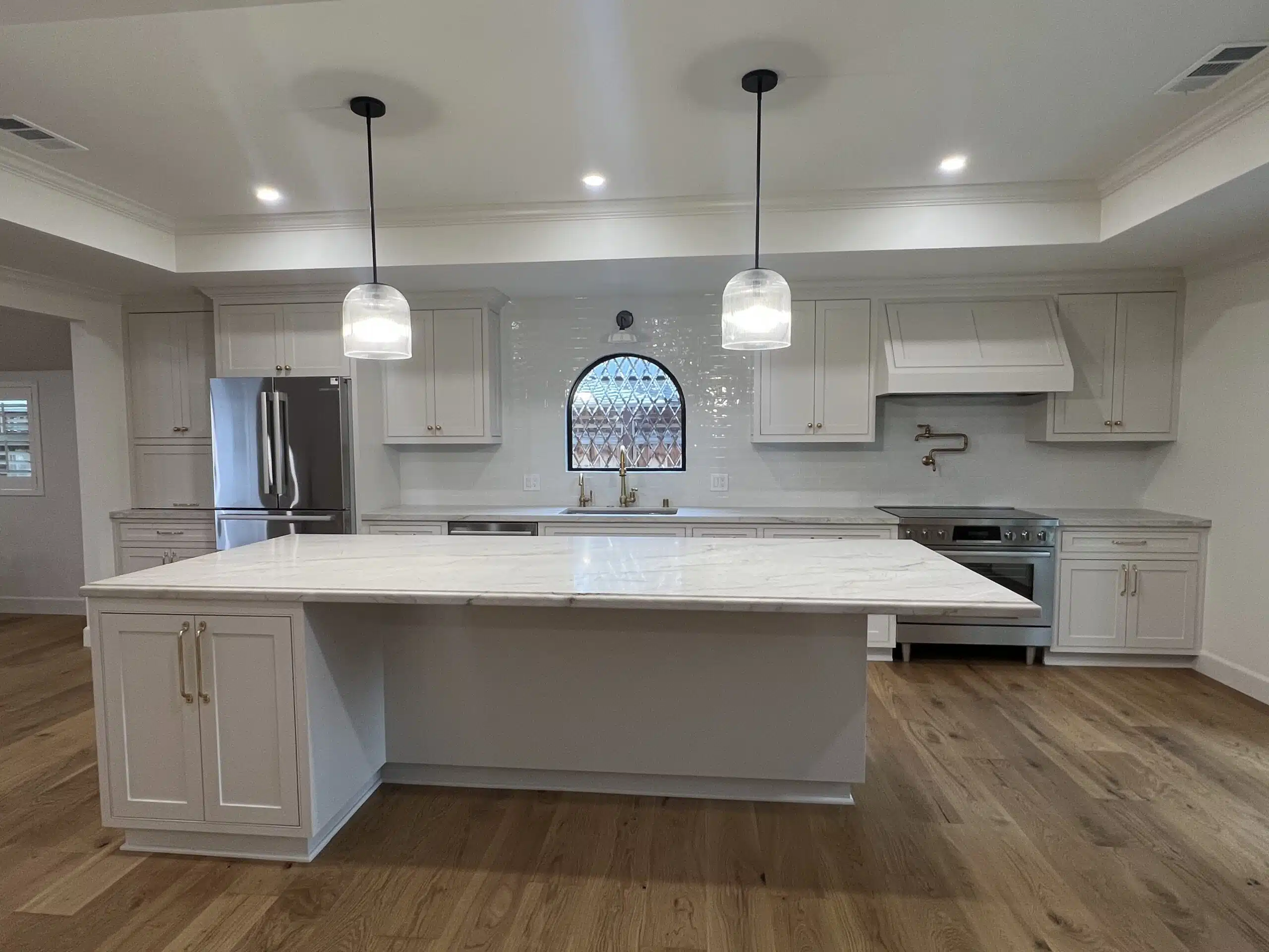 A sophisticated arched stained glass window custom-designed to be the focal point of a contemporary kitchen. The panel features a classic beveled diamond pattern that provides texture and privacy while allowing light to flow. Set within a fixed wood frame and made with tempered insulated glass, this piece offers lasting elegance and energy efficiency above the sink.