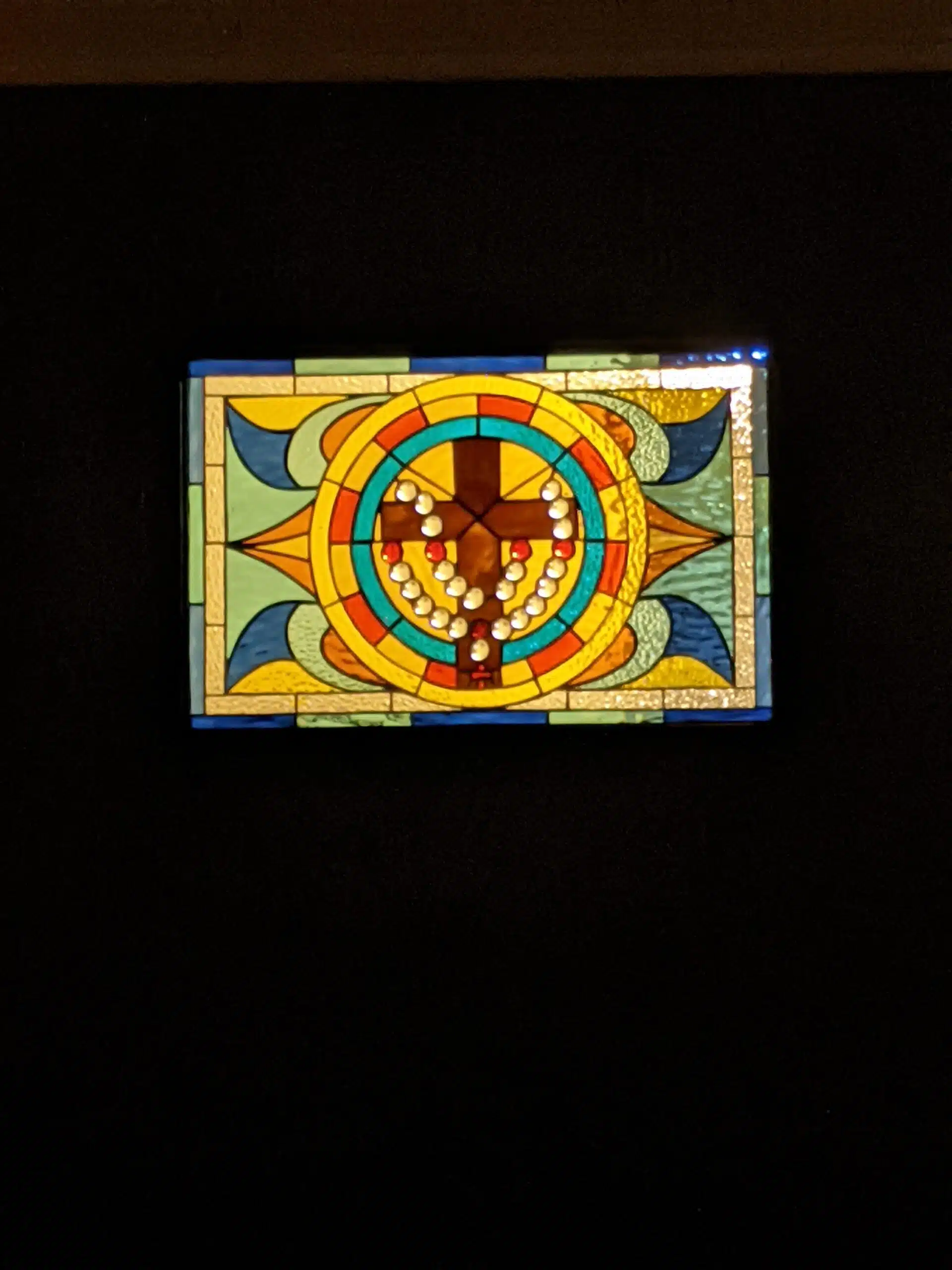 Custom Cross and Rosary design, we created stained glass in tempered glass 22 x 14 1/2 to be put into their door