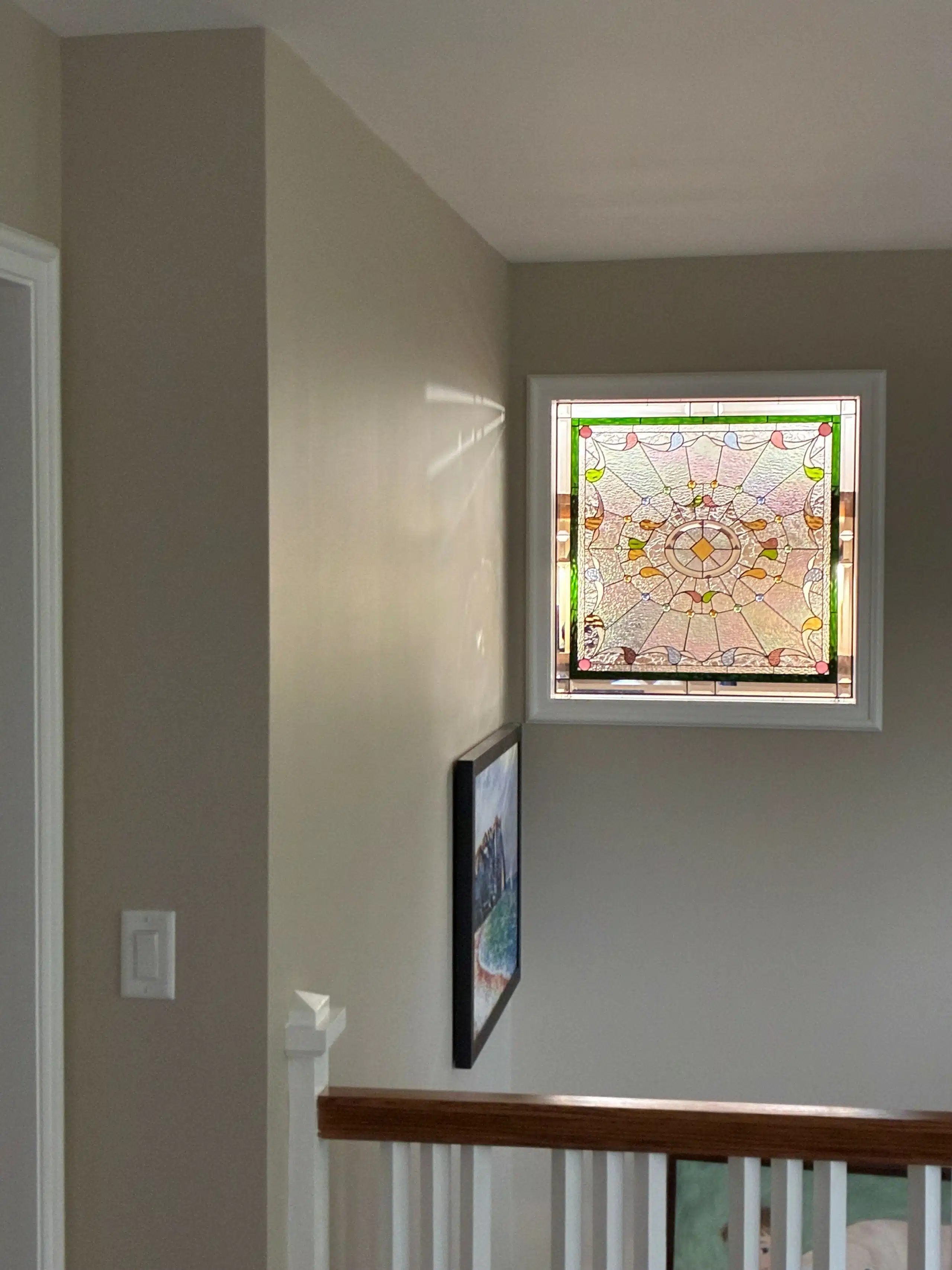 A beautifully intricate Victorian-style stained glass panel featuring a central rosette pattern accented with colored glass “jewels” and teardrop pieces. Custom-made to a perfect square size, this exquisite piece adds a touch of classic elegance and radiant color to this landing, perfectly capturing and diffusing natural light.