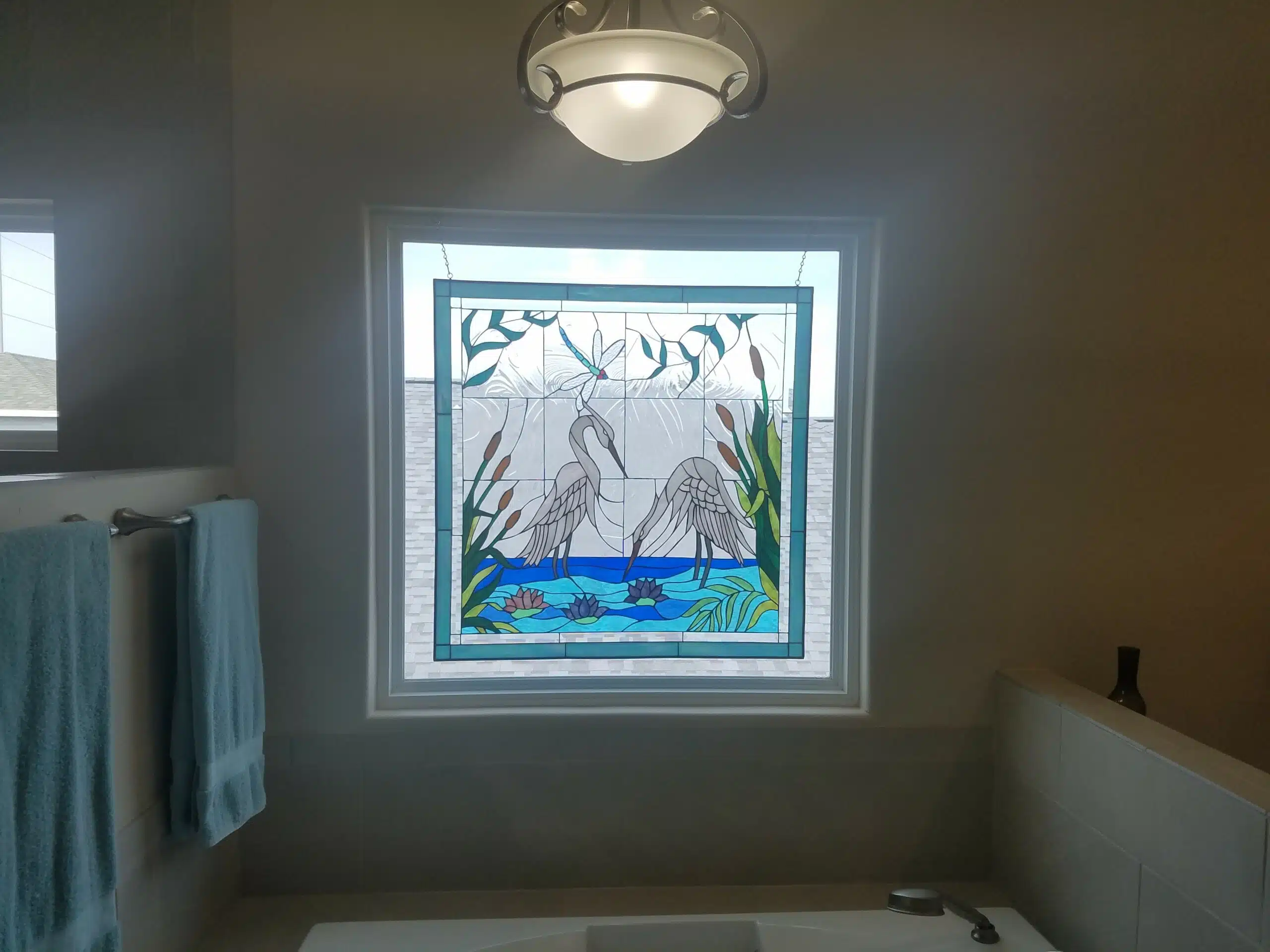 Egret And Water Lilies Stained Glass Panel Hung Above A Bathtub For Decor & Beauty