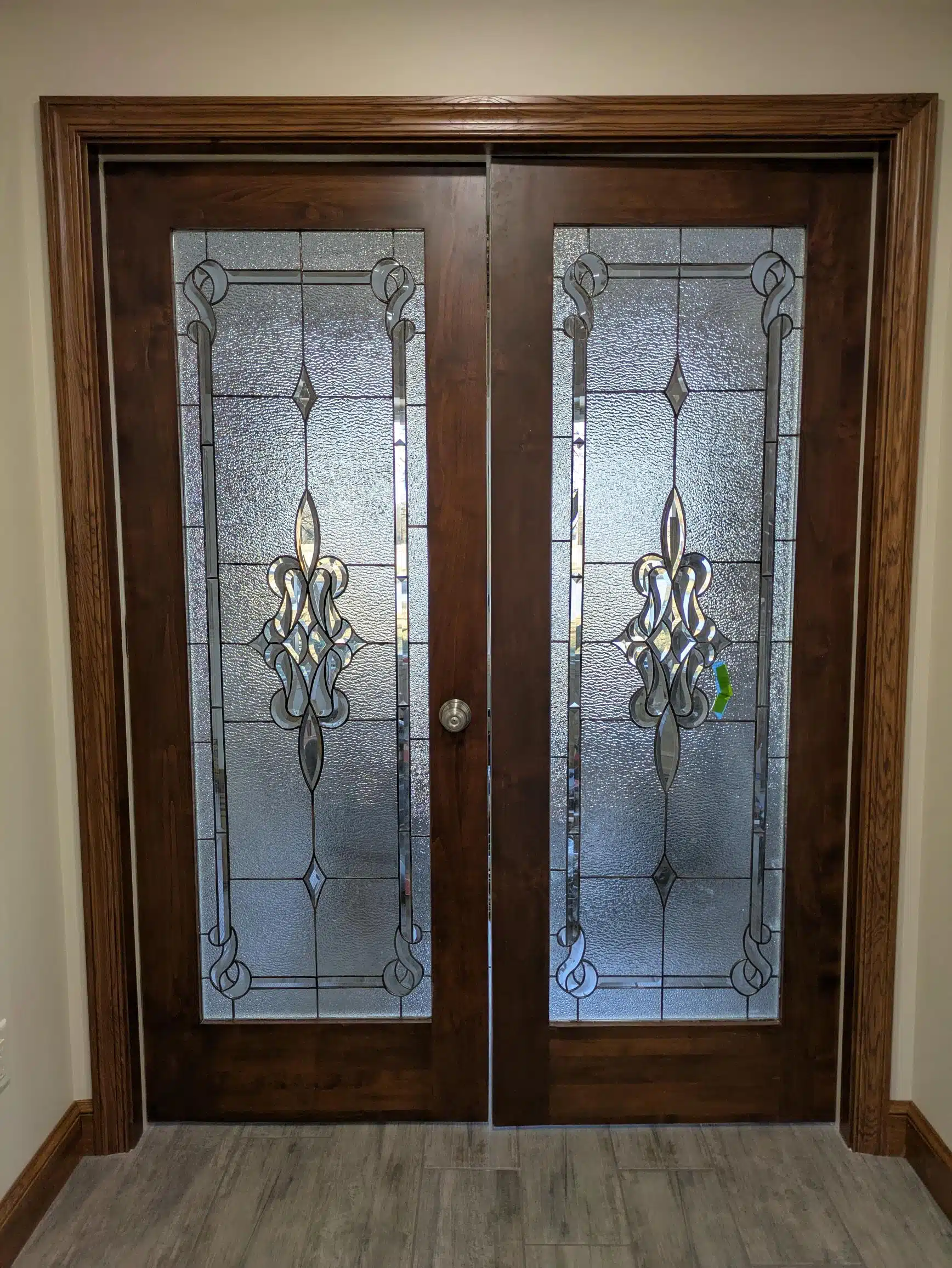 These beautiful doors are transformed by their stunning glass panels. The elegant beveled and textured design allows light to beautifully flow between the rooms, creating a bright, open feel while adding a touch of classic sophistication.