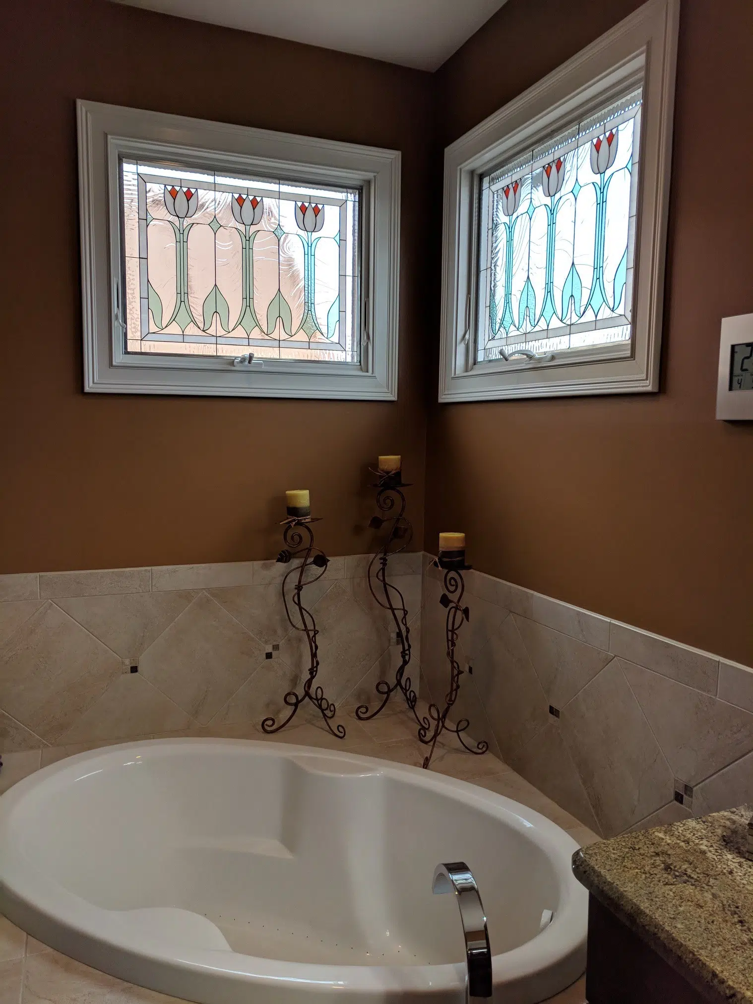 Elegant Crank-out stained glass English tulip windows installed in a bathroom