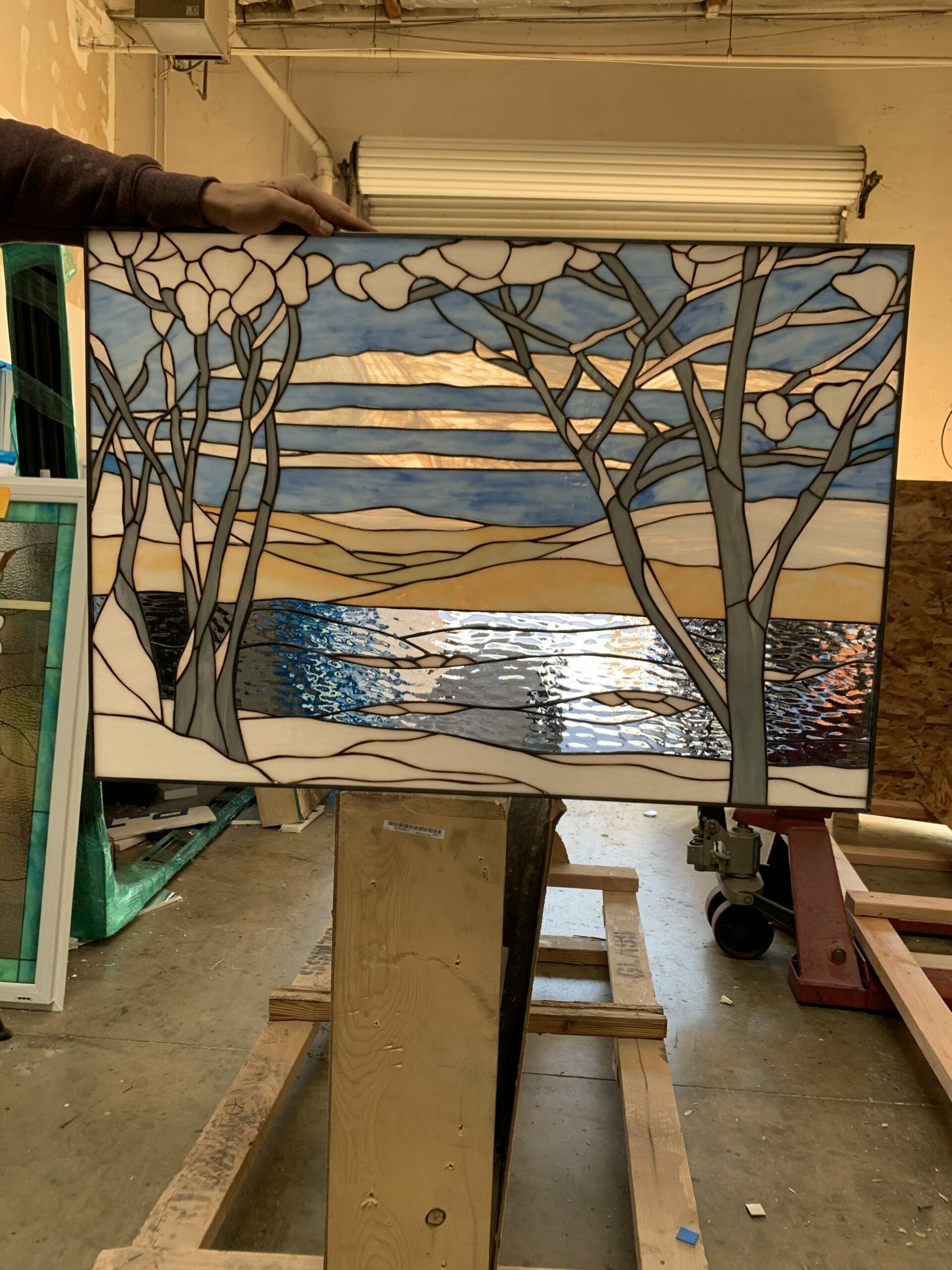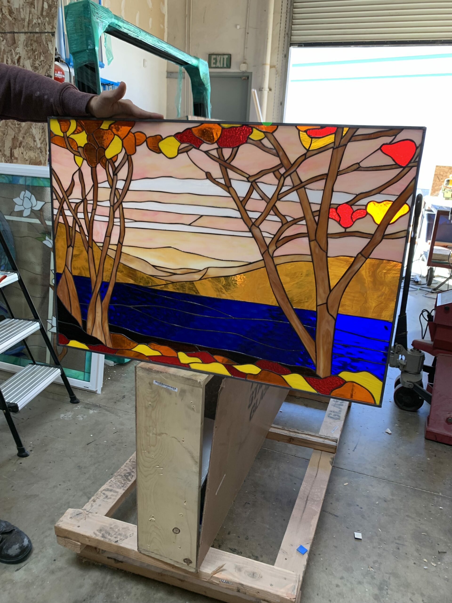 Four stained glass panels made at 33 3/4 x 23 3/8 to mount up against client large clear window and stack on top of each other.