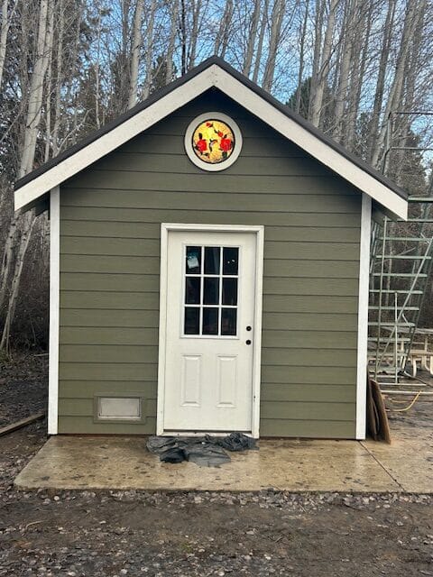 A charming circular stained glass window installed high in the gable of a custom garden shed. This artistic centerpiece features a colorful scene of a hummingbird hovering among vibrant red flowers against a warm, amber-toned background. The piece adds a unique pop of personality and craftsmanship to the structure, perfectly complementing the forest-green siding and peaceful wooded surroundings.