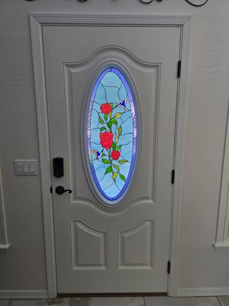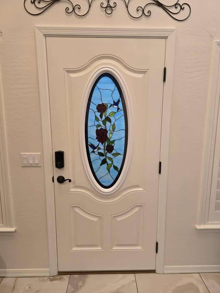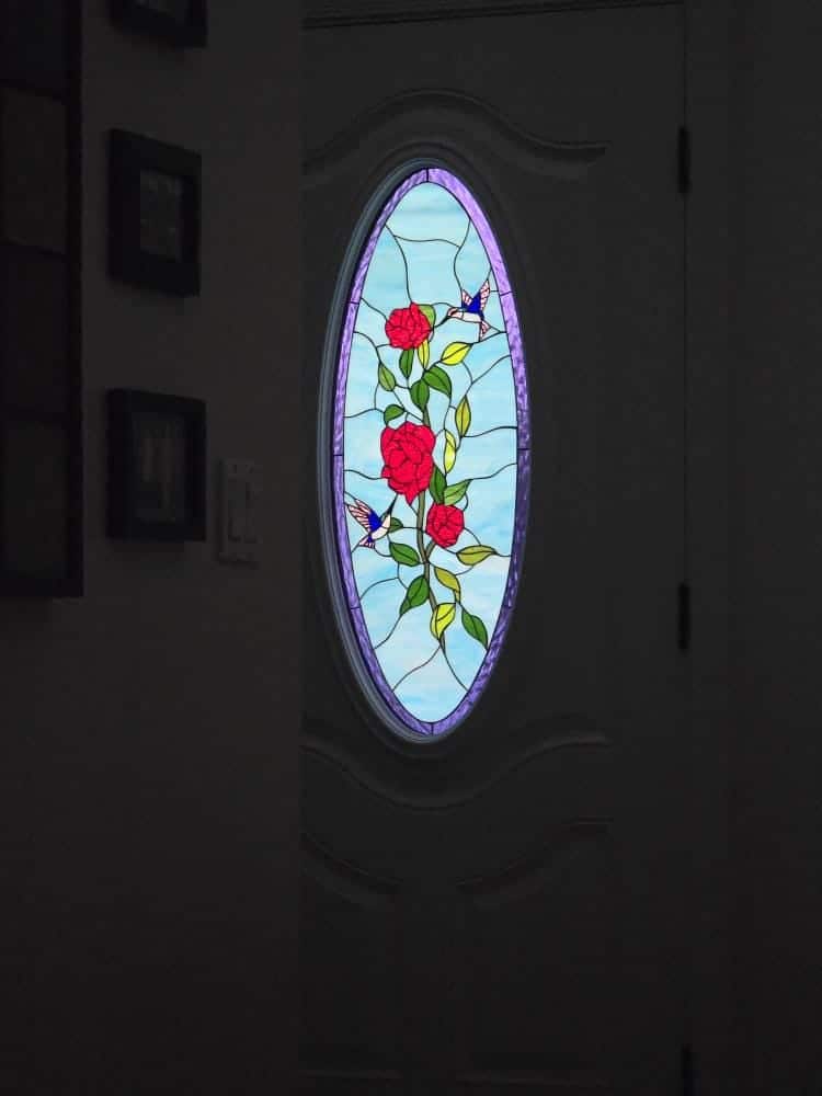 A beautiful and welcoming entryway panel featuring a classic oval-shaped stained glass design. The piece showcases vibrant red roses climbing a vine, complemented by two delicate hummingbirds set against a soothing blue background. This design adds a lovely touch of nature and color to the home’s door.