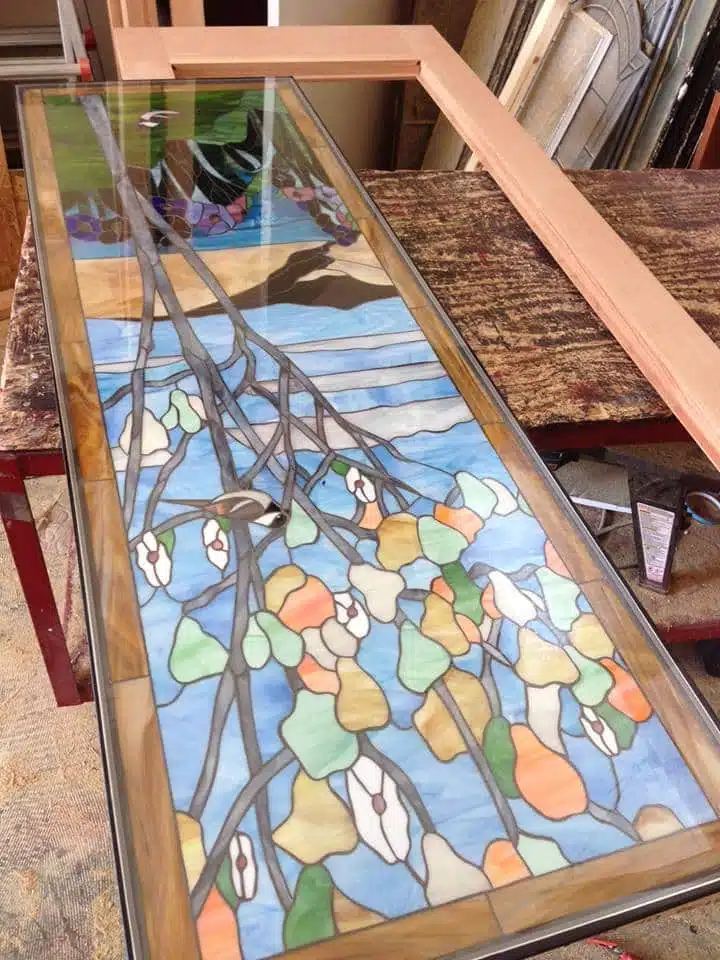 Impact Resistant Tiffany Tree Stained Glass Insulated Panel Being Inserted Into a Door