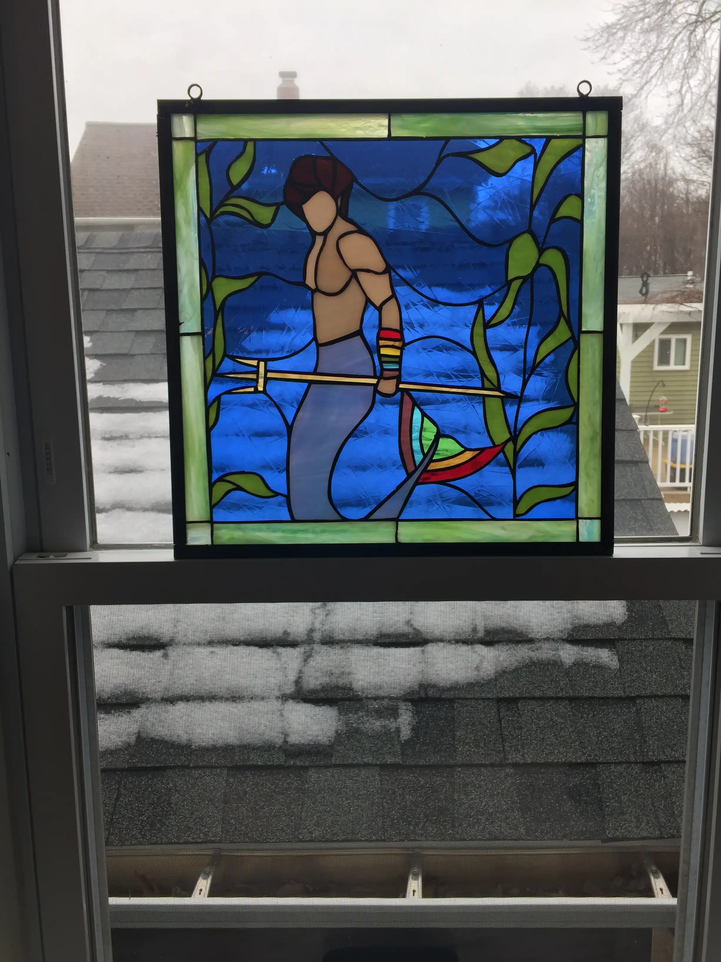 Merman Stained Glass Panel Suspended in a Window With Chains