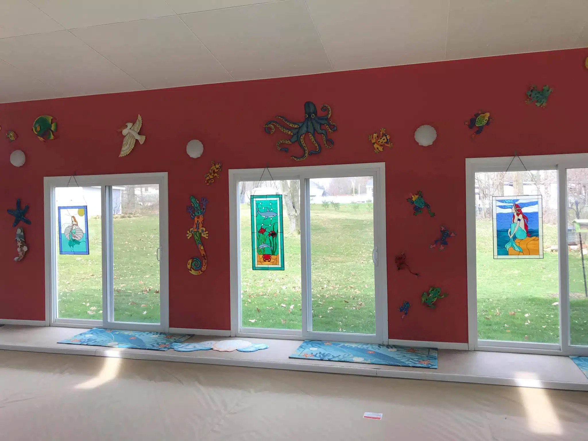 Multiple Ocean Theme Stained Glass Window Panels Hung By Hooks and Chain