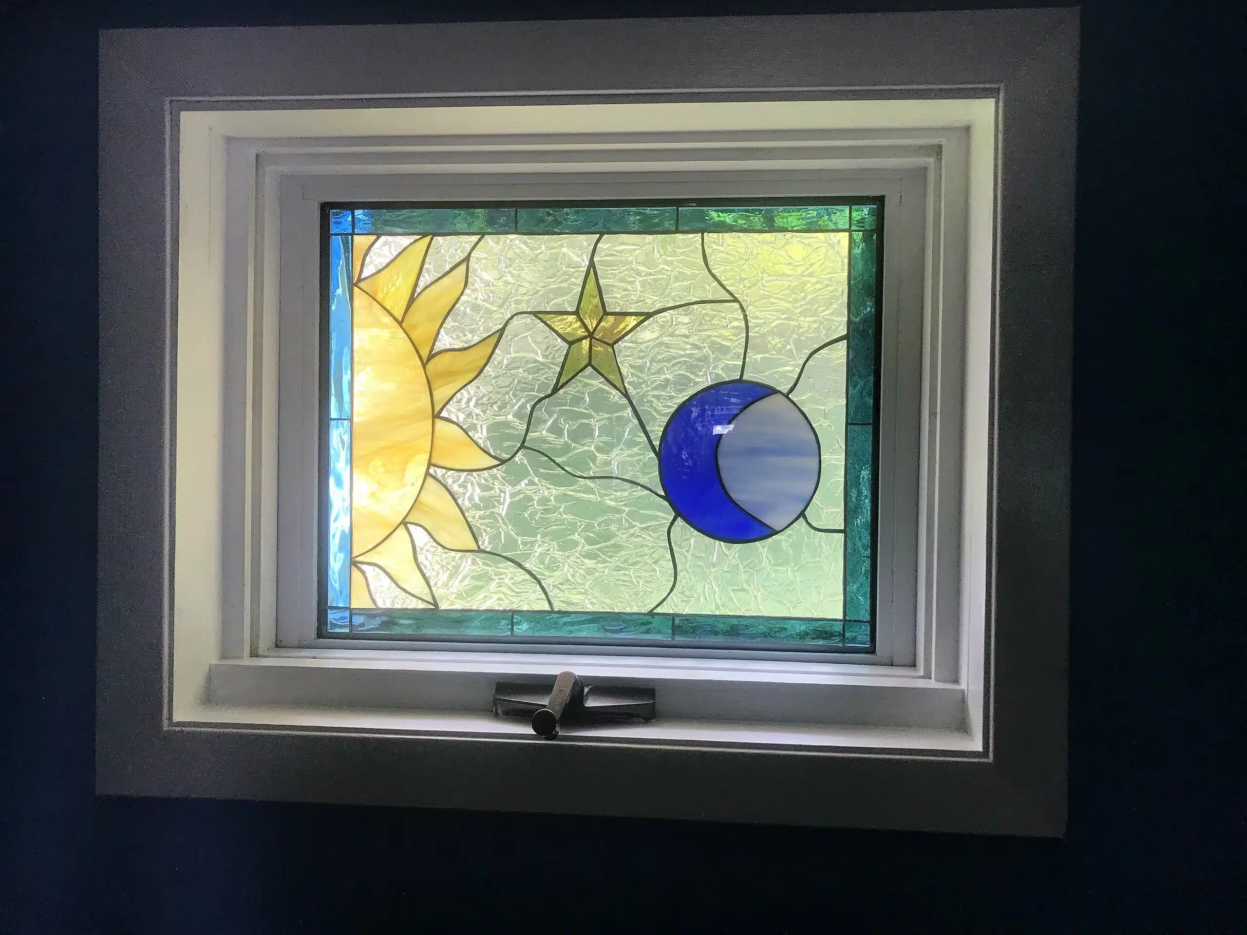 Mystical sun, moon, and star window installed in a crank-out vinyl frame