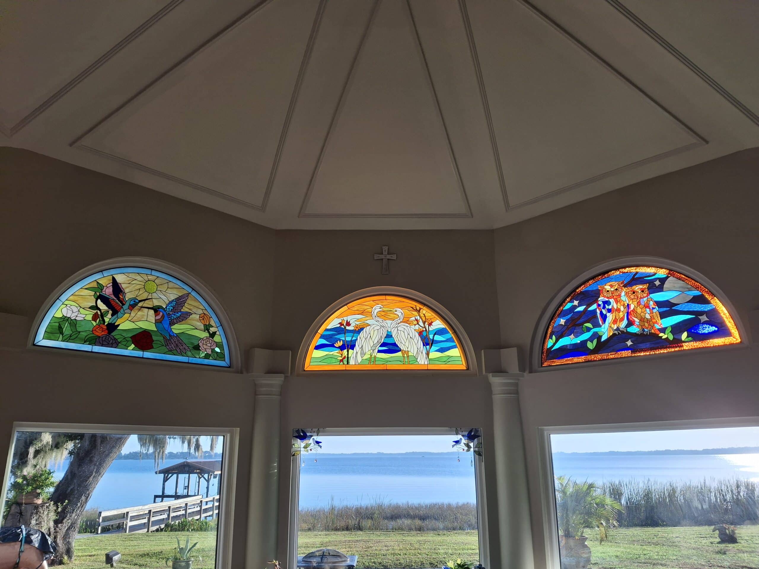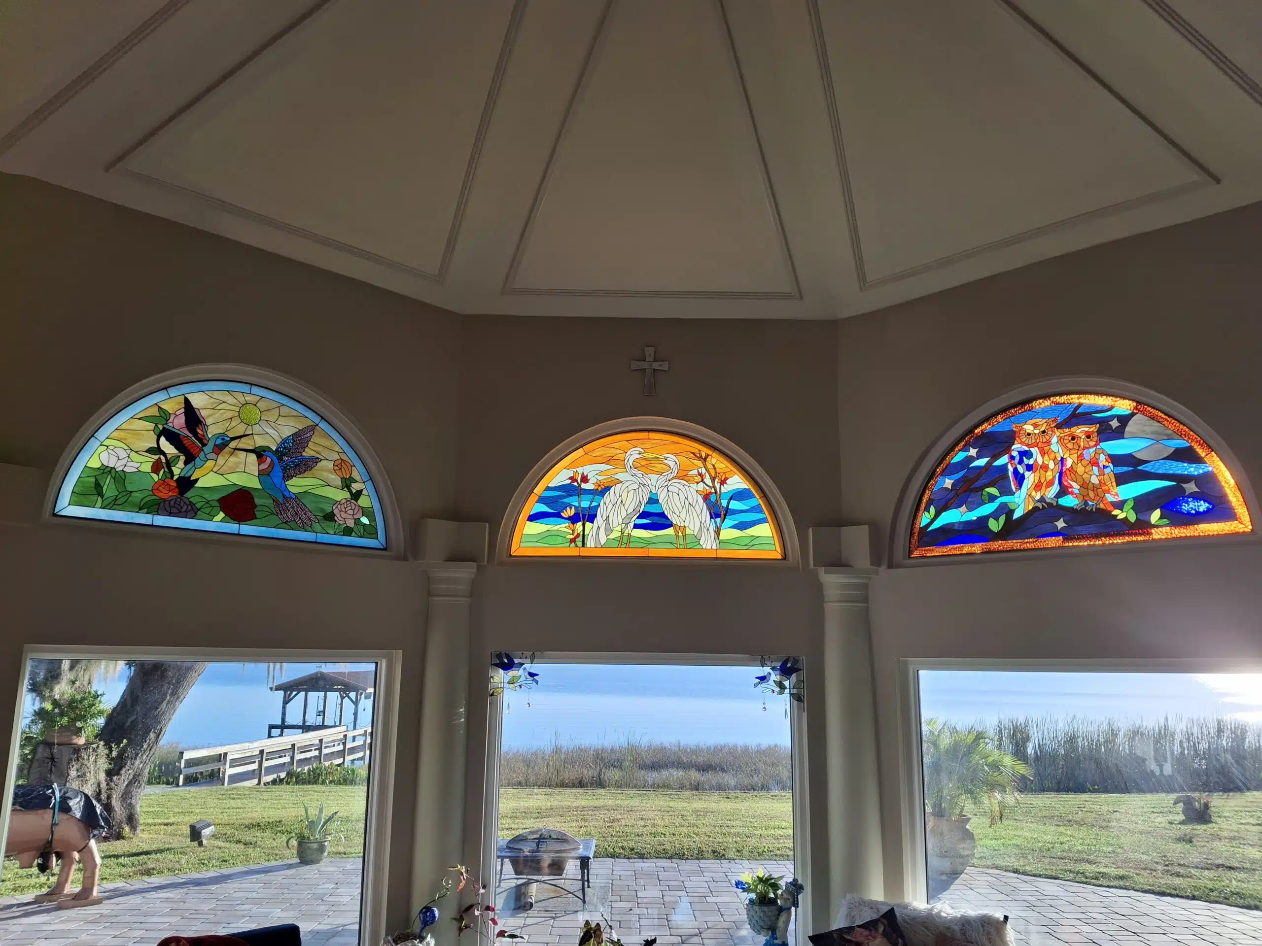 A breathtaking installation of three custom arched stained glass transoms that showcase the beauty of nature. The vibrant triptych features captivating designs, including a hummingbird and monarch butterfly, a pair of elegant swans, and a depiction of two owls. These colorful panels flood the room with light, creating stunning visual accents high above the exterior views.