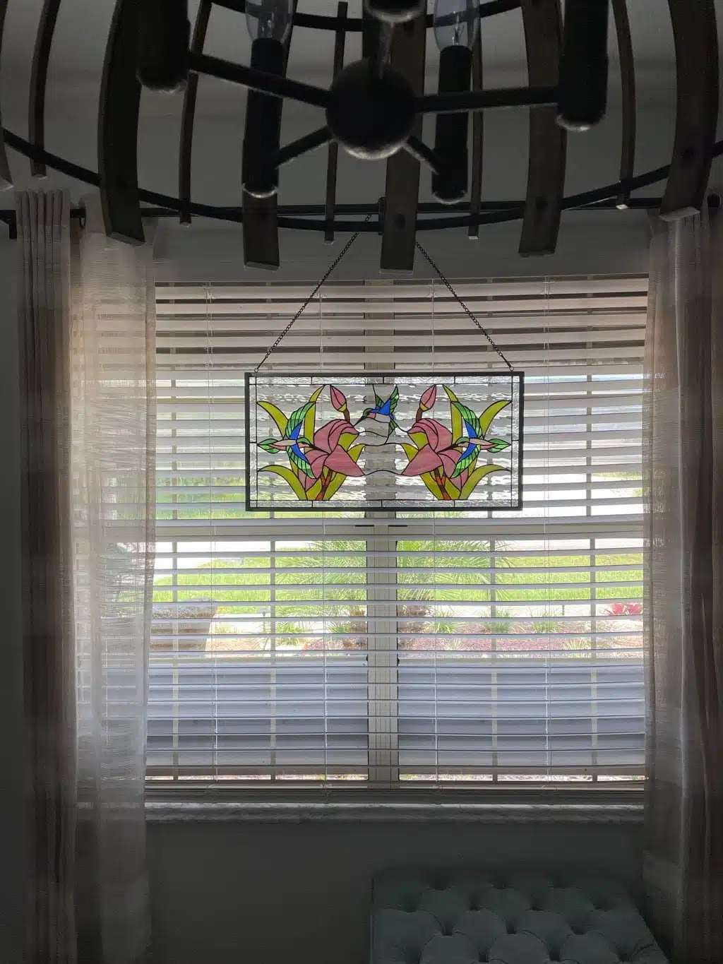 Nice! Hummingbird & Lily Stained Glass Window Panel Hung with Hooks and Chain