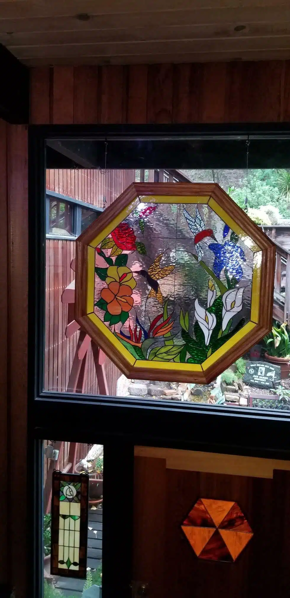Octagonal Hummingbird Paradise Stained Glass Installed