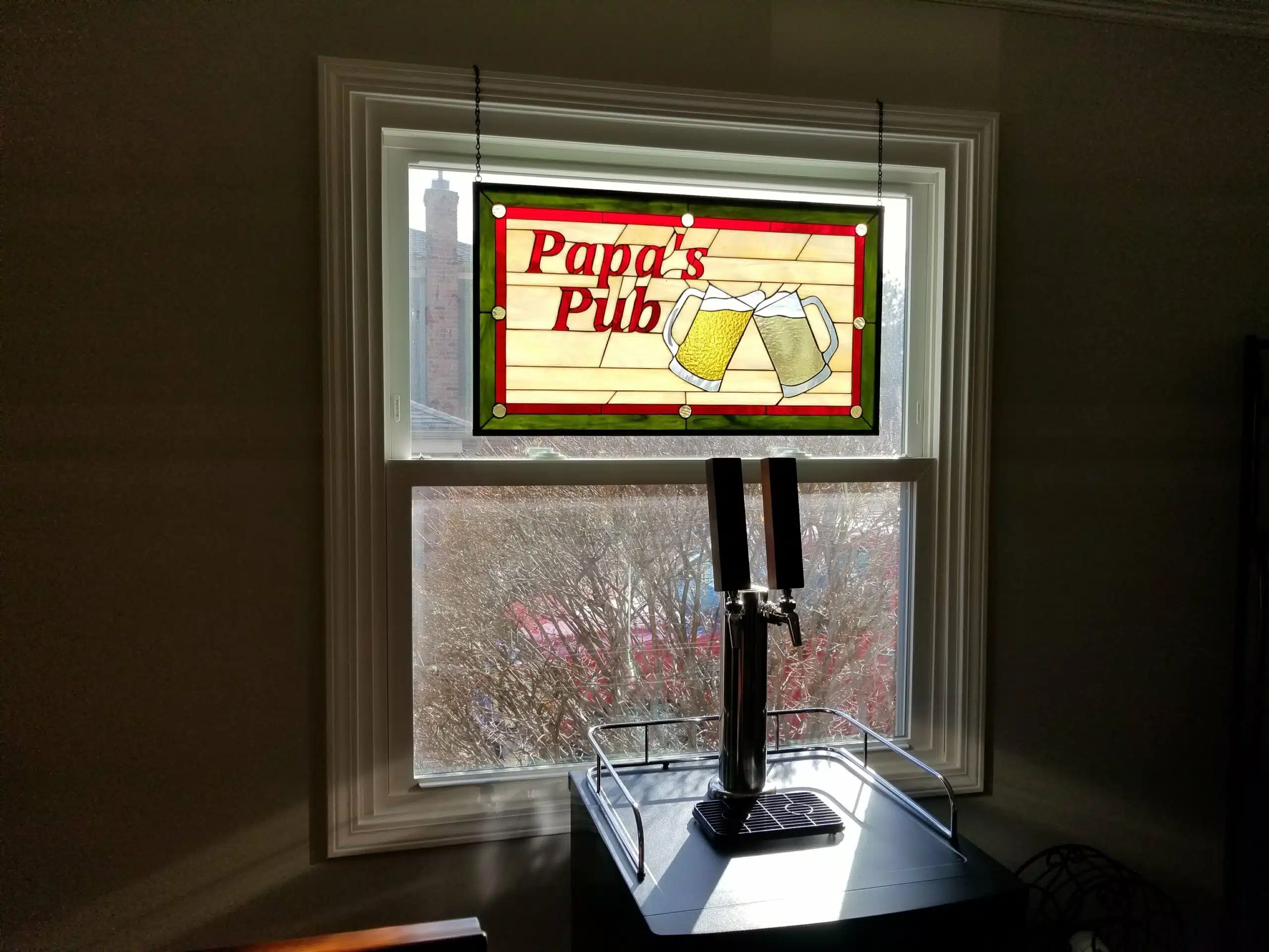 Personalized stained glass hanging panel for a home brewery