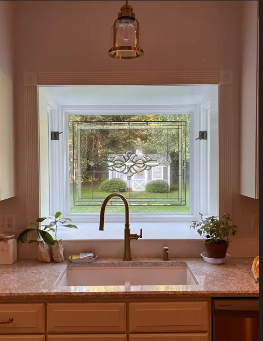 This custom beveled glass panel serves as a stunning focal point, transforming a simple kitchen window into a work of art. The intricate design gracefully frames the view, adding a touch of elegance and character to the entire space.