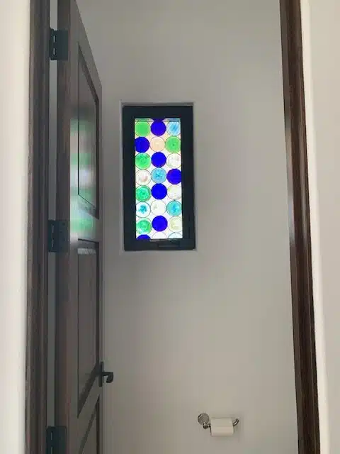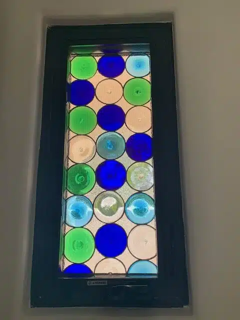 rondel installed, sealed within tempered glass to install into clients window frame.