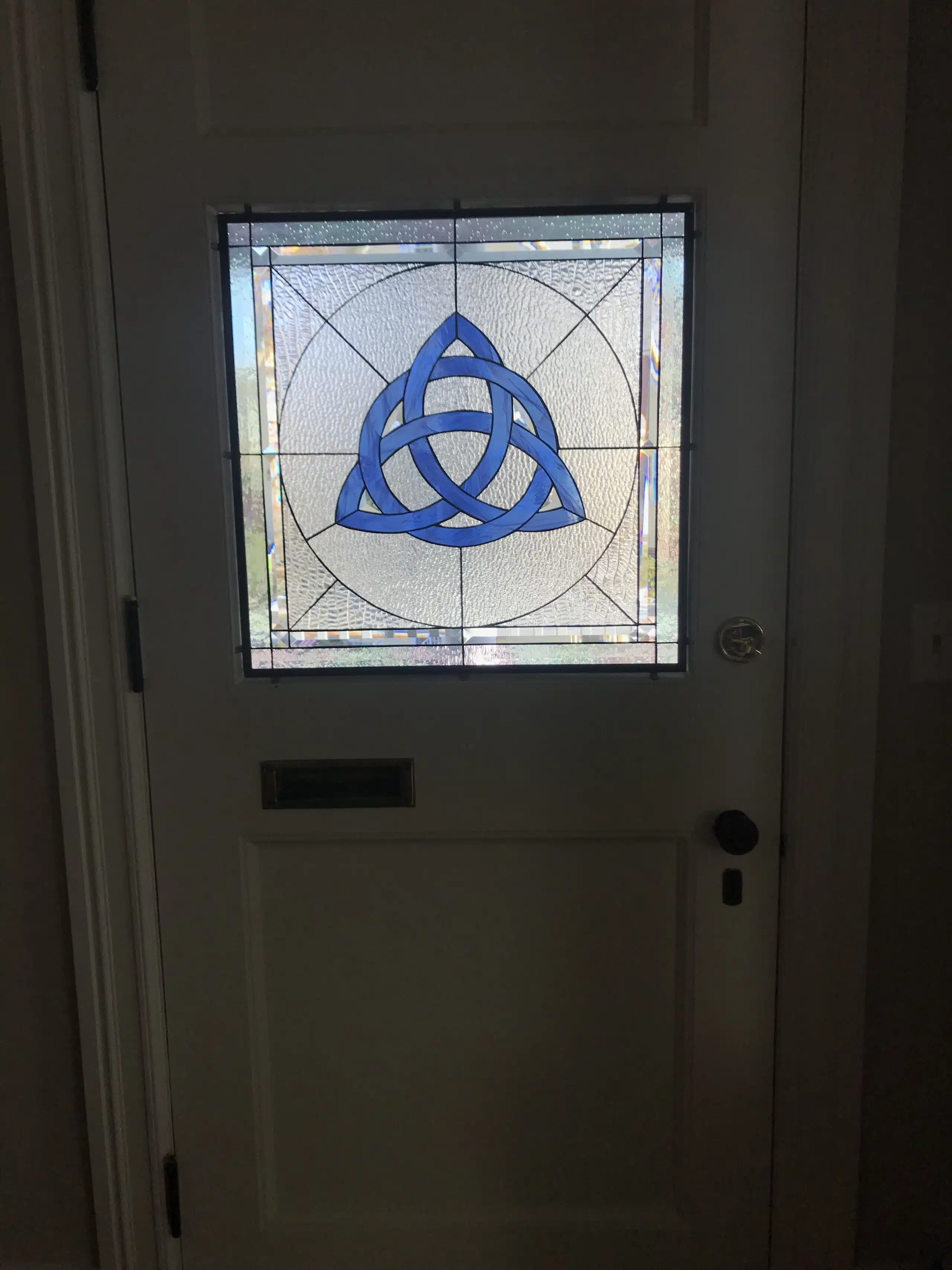 Single pane Celtic Knot stained glass inserted into a door with mirror clips