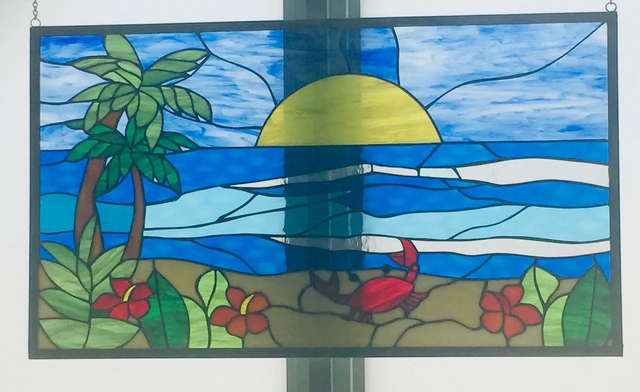 Crab, Palm Tree, Flowers & Sunset Leaded Stained Glass Window Panel Hang with Hooks and Chains in front of a window.