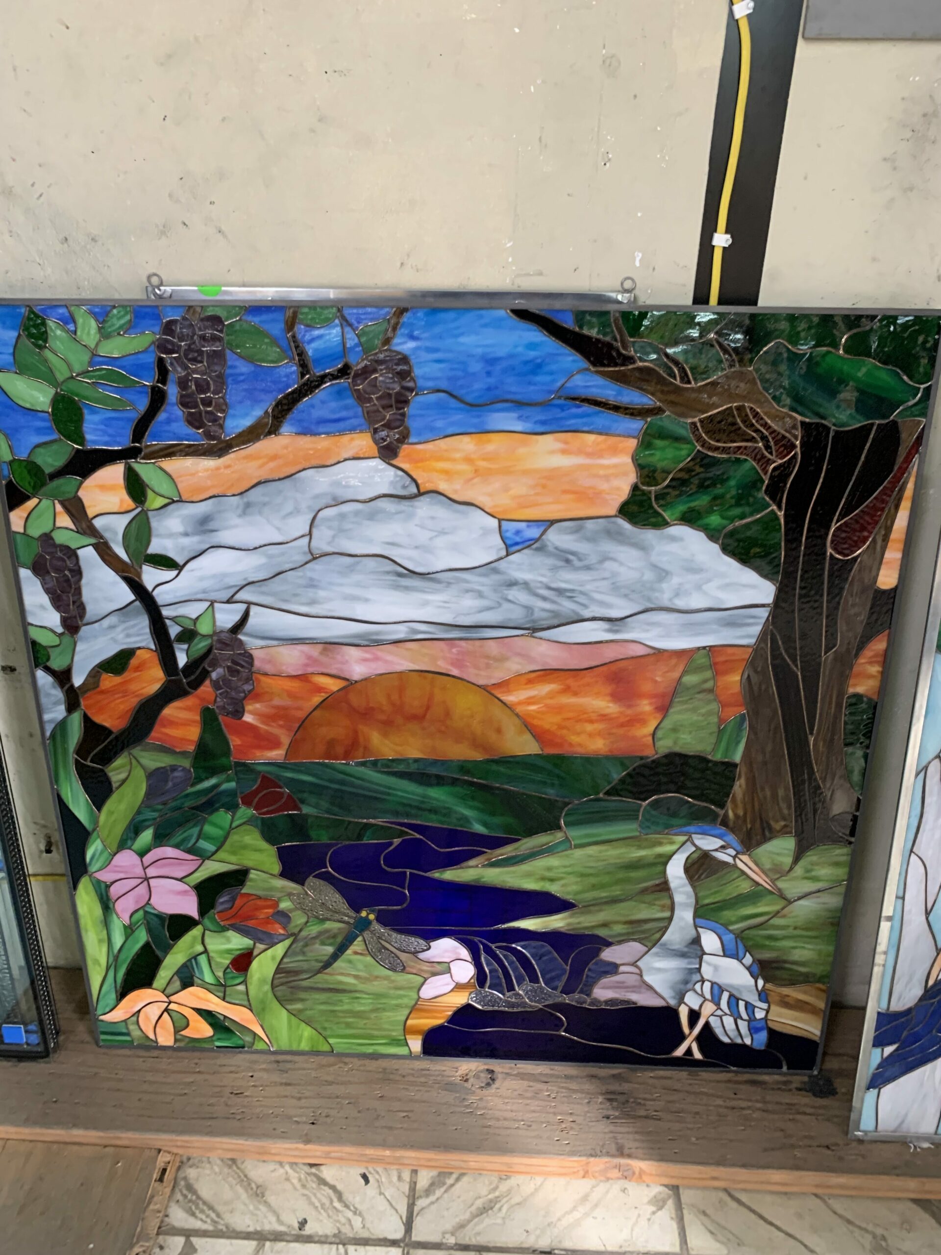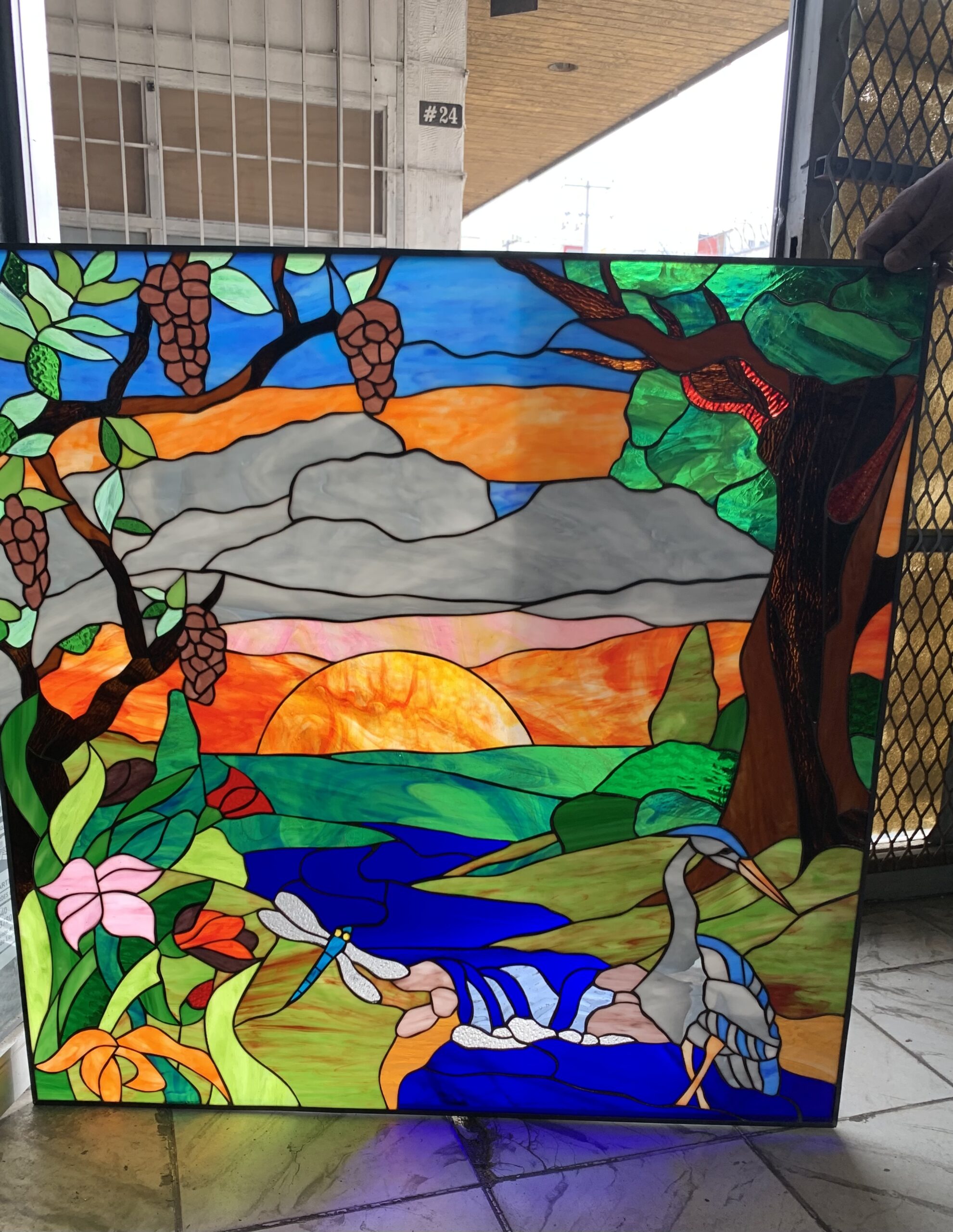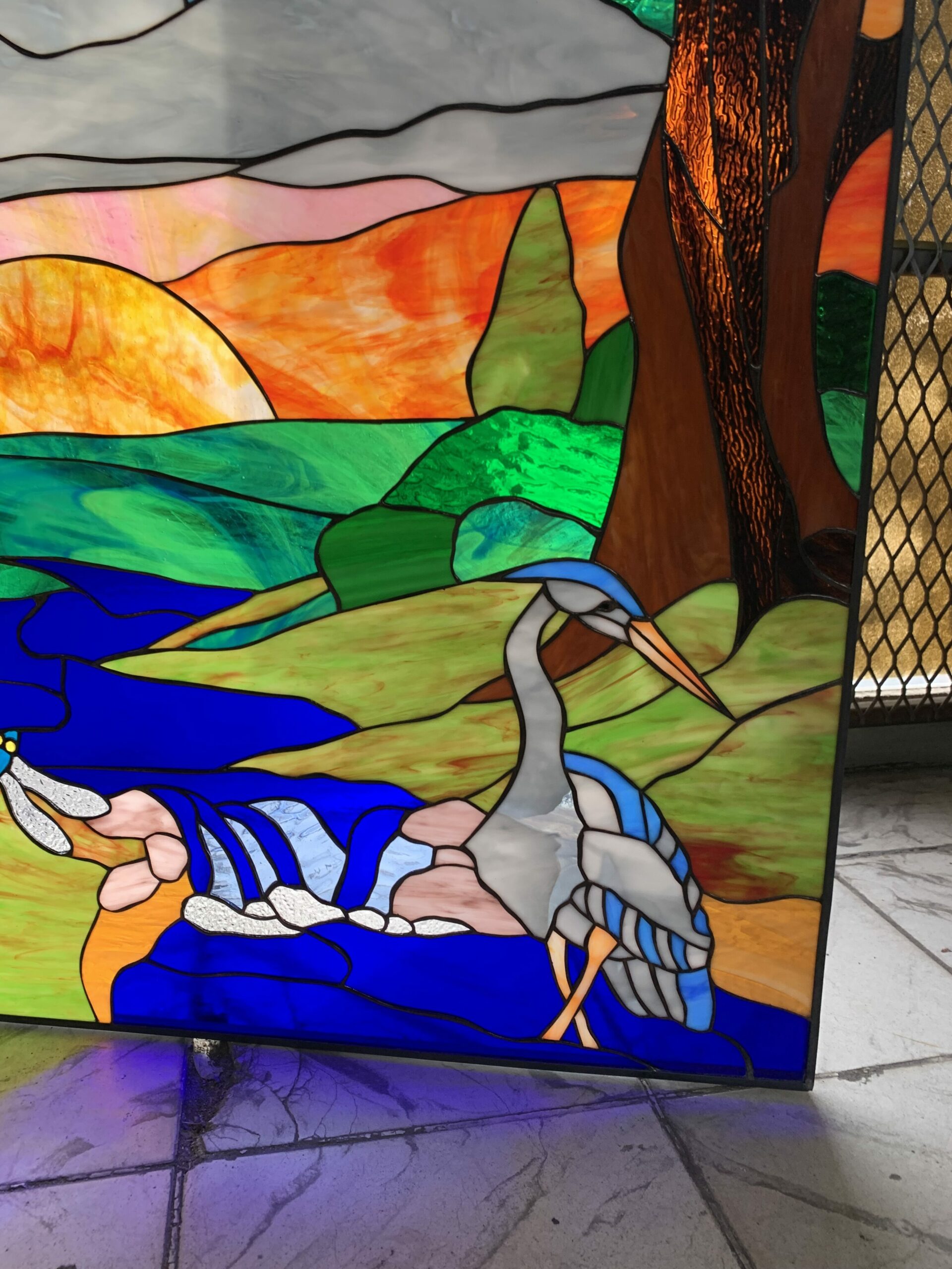 “Sunrise in The Garden of Eden” Stained Glass with a Tree of Life, a beautiful Heron, flowers, sun, sky, and a running stream.