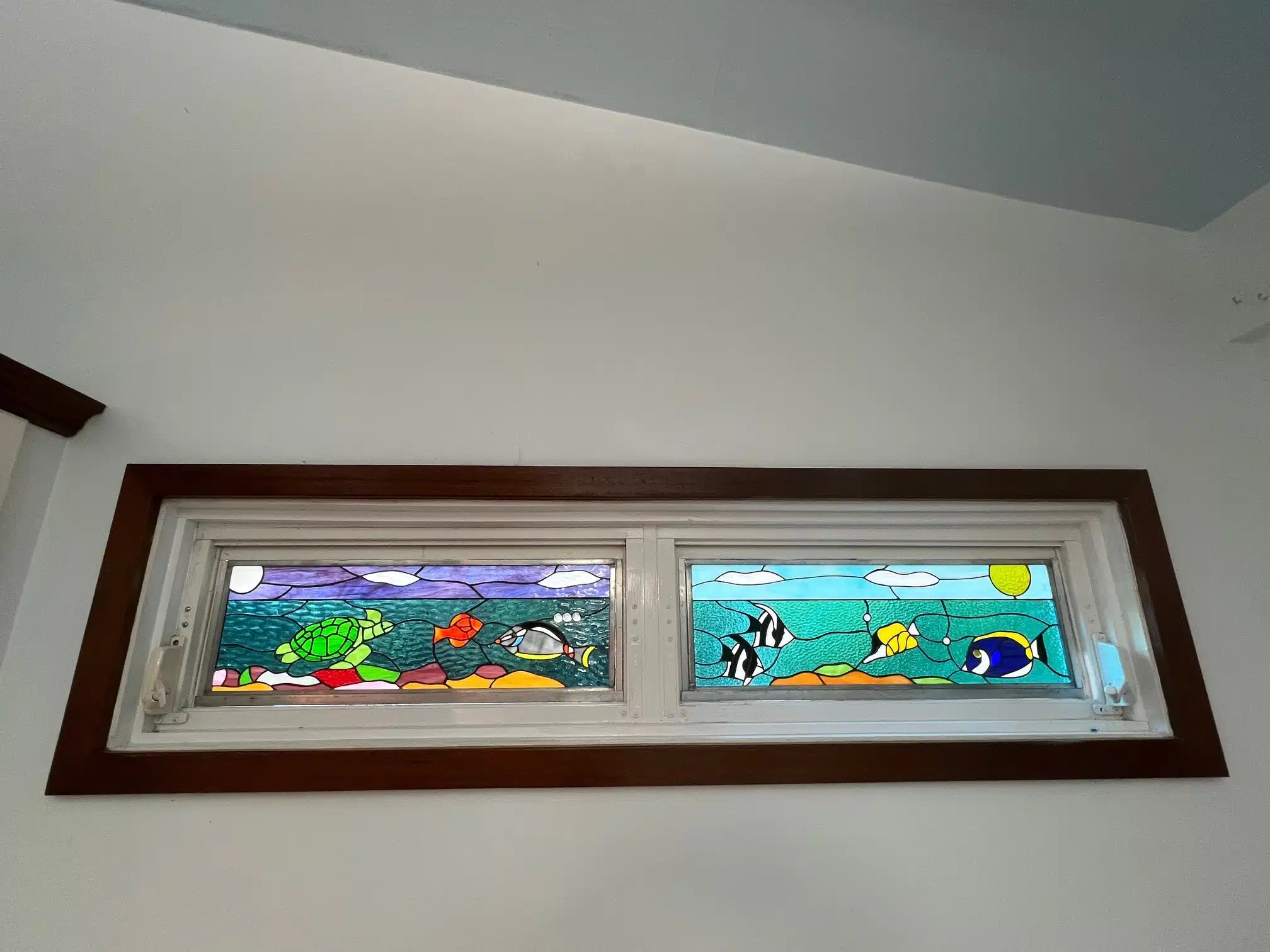 A vibrant stained glass window capturing a whimsical underwater world. The design features a colorful sea turtle and playful fish swimming through a lively reef, bringing a touch of the ocean’s magic into any space.