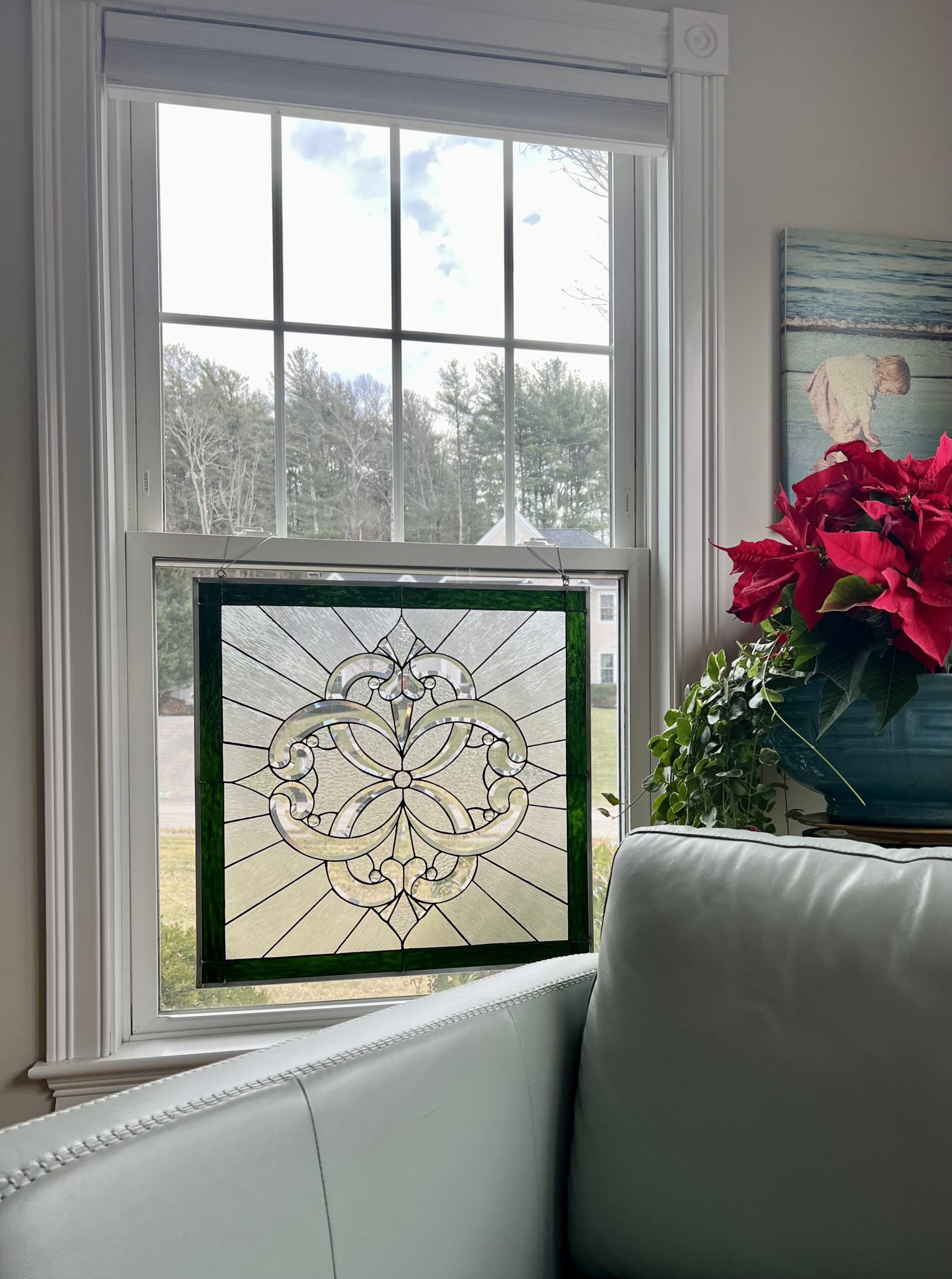 A graceful handcrafted stained glass panel featuring a central, elegant, clear beveled glass accents. The design is framed with a deep emerald green border and utilizes textured glass sunburst lines to create a beautiful play of light. This hanging piece provides a classic artistic touch to the window while maintaining an open view of the outdoors.