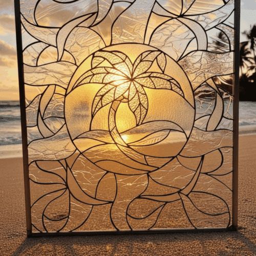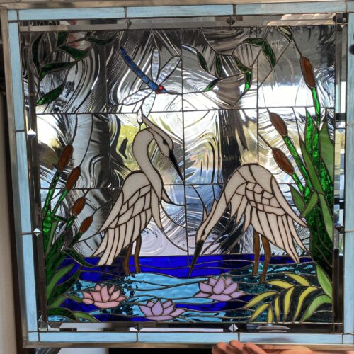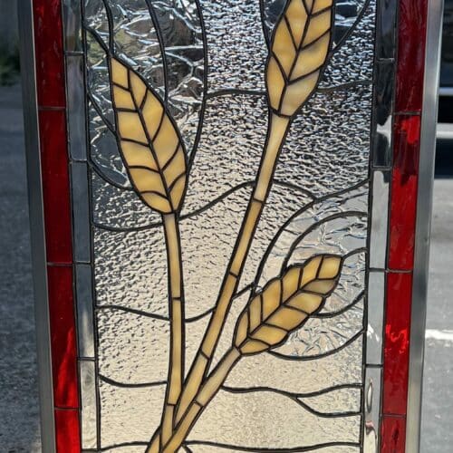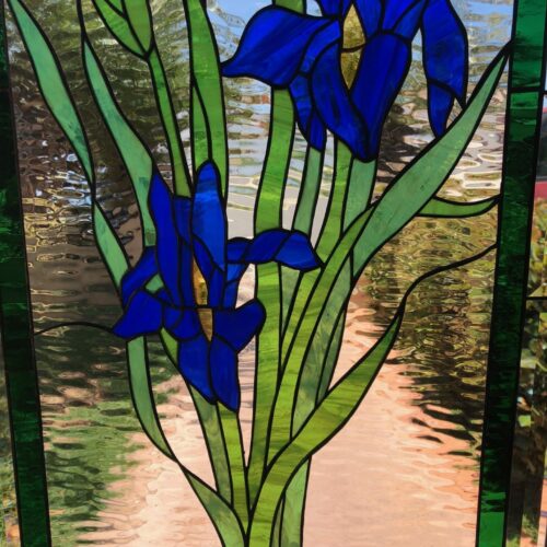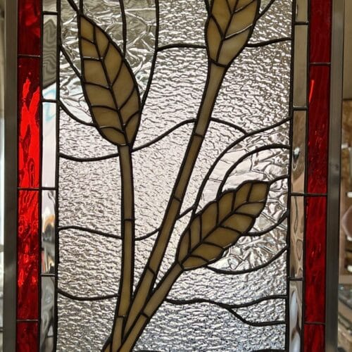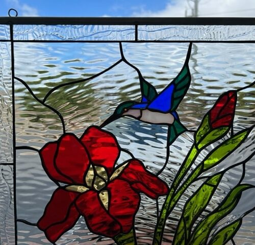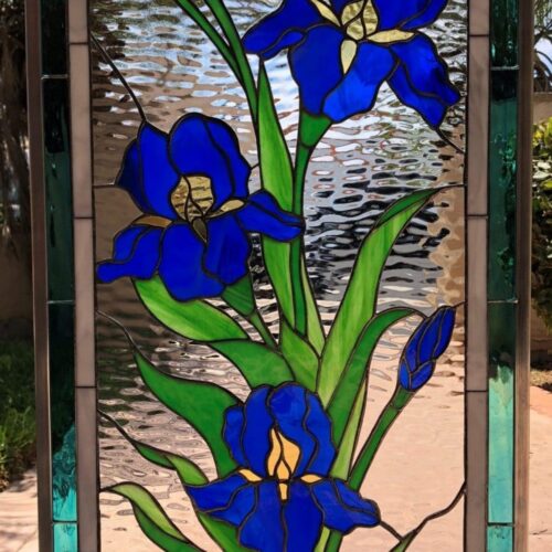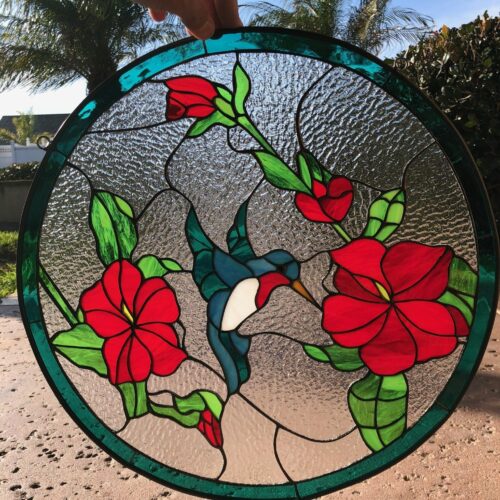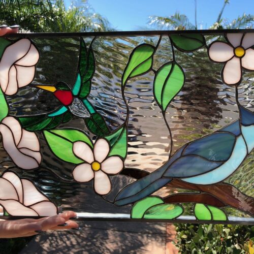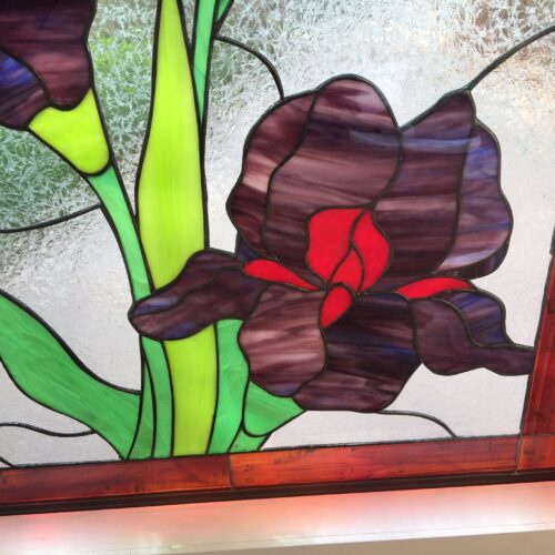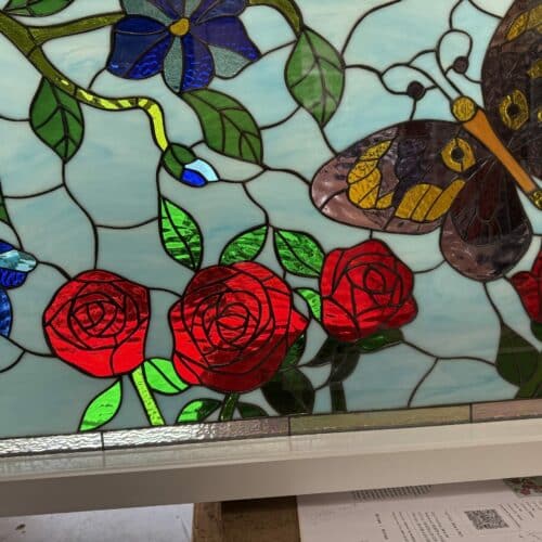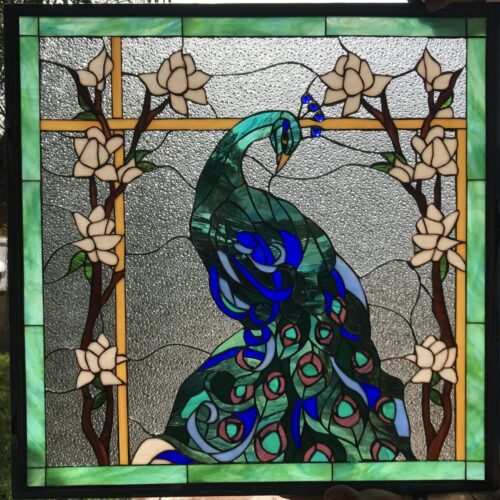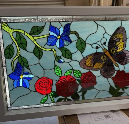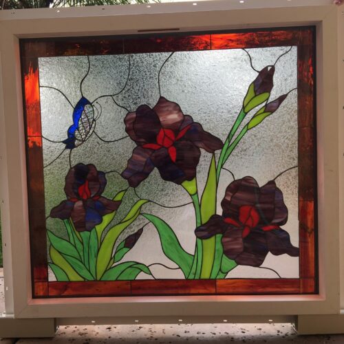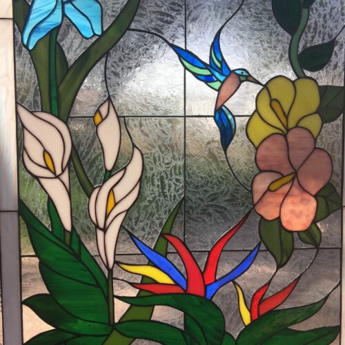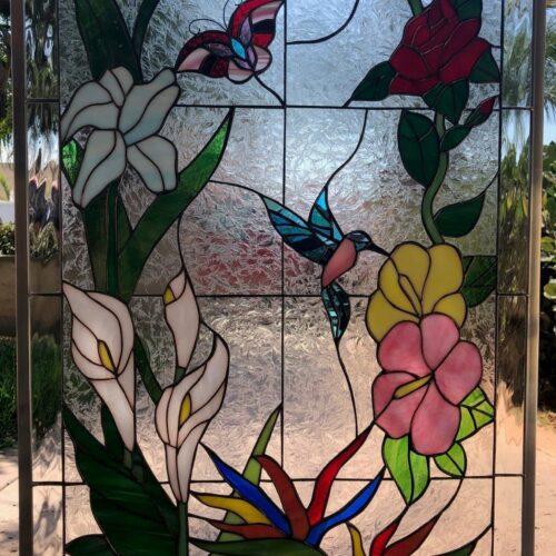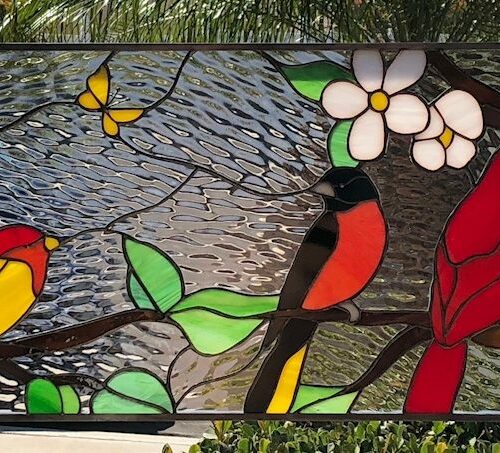 Large selection of Nature-inspired stained glass windows. Flowers, fruit, birds, butterflies, animals, and more. Custom-made to fit any window size or shape.