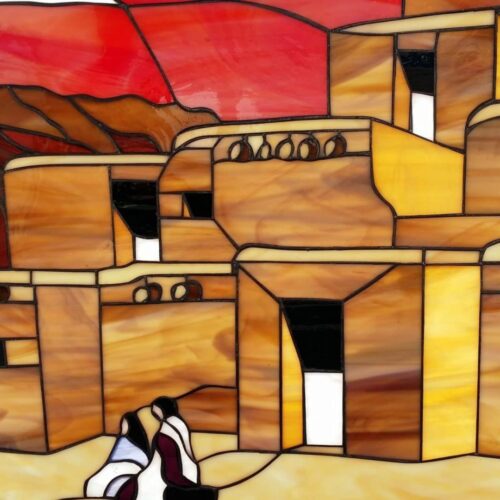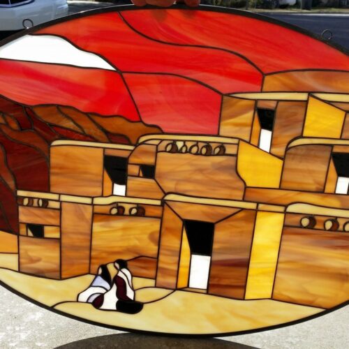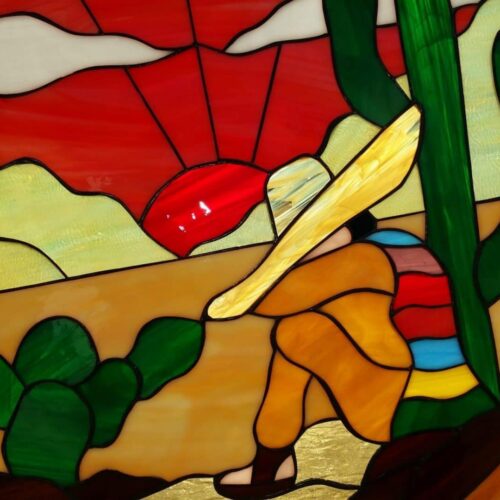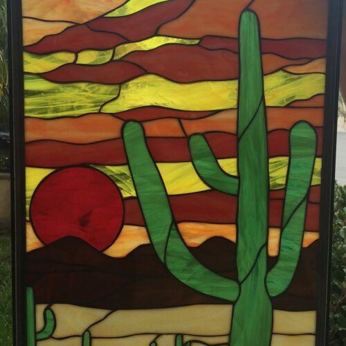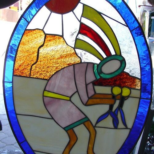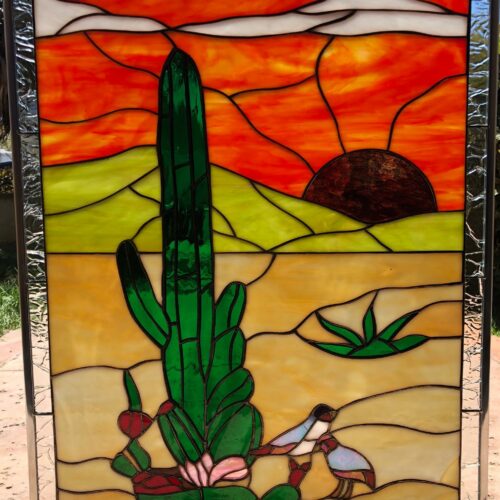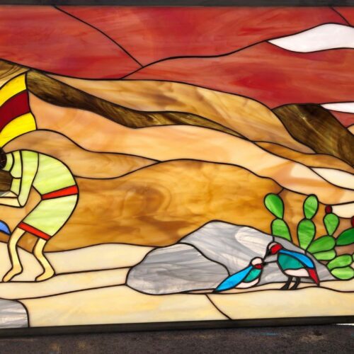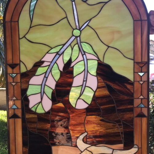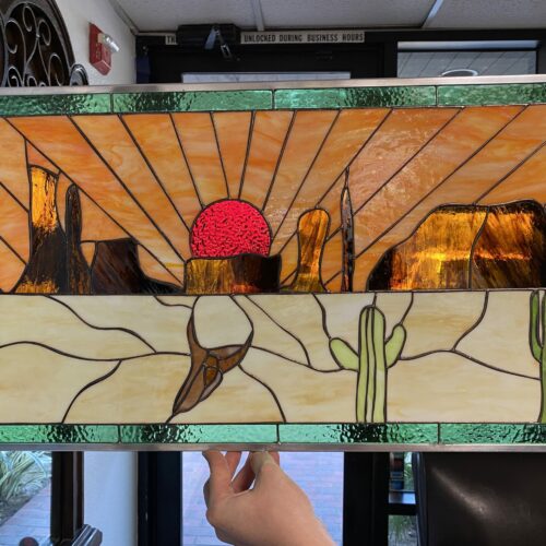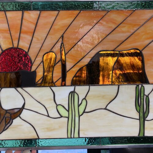 Large Selection of Southwestern Stained Glass Windows including Horses, Desert, Skull, Lizard, Navajo, and Many Others. Free Customization to fit any window.