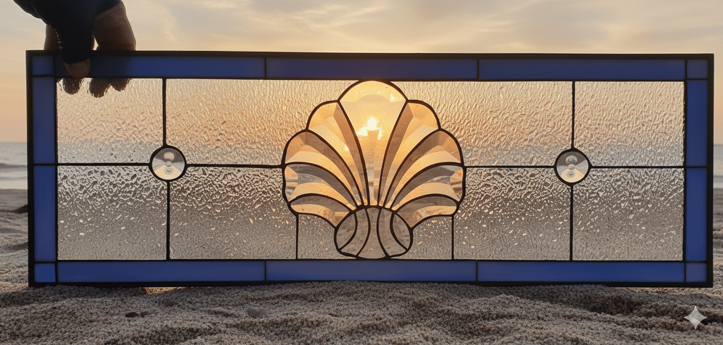 Give an old transom a facelift with the elegant Santa Margarita shell leaded stained glass window panel. This beveled design offers a sophisticated way to add more light in above entryways or even inside your home where more light is deserved. When you use stained glass in a transom, it takes on a whole new look with a classic touch that makes any space more valuable. Customize it in any size and change old cabinets with the Santa Margarita beveled shell design crafted into a cabinet insert to add beautiful charm to your kitchen or bathroom cabinetry.