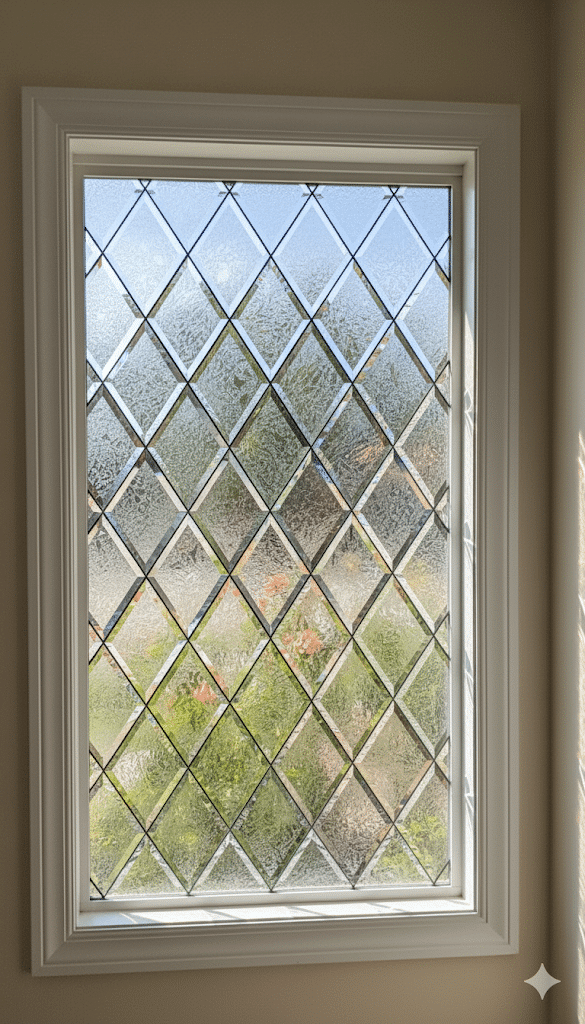 Contemporary or classic, your home could always do with more natural light. Let that light shine in without worry of giving up privacy. Our frosted privacy beveled glue chip diamond stained glass window panel is simple yet ornate in design. It cultivates the look of diamonds shimmering in the light for an ideal accent surrounding your front entry and foyer area or in bathrooms, bedrooms, and dining areas. Bring an element of design with a simply elegant feel, one that sparkles like diamonds.