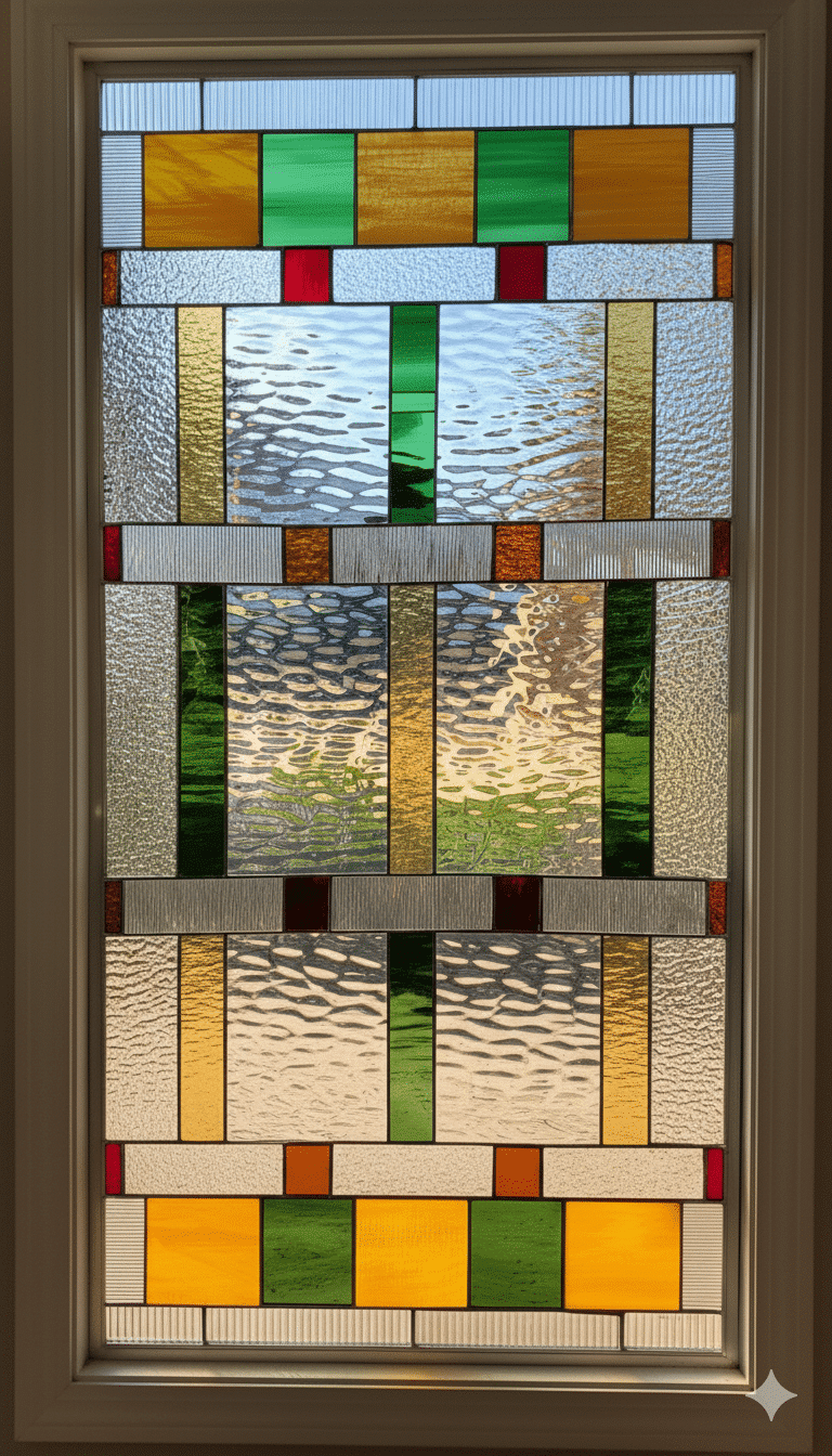 Inspired by the historically beautiful Spanish missions of La Jolla, our prairie style stained glass window is a geometric tribute to this classic design. The La Jolla mission prairie style stained glass combines yellow, green, red, and textured clear glass in an array of shapes and sizes to create a layered look, one that will add depth to your space while securing your privacy. Bring out the classic style in your home with a design that brings the past into the present.