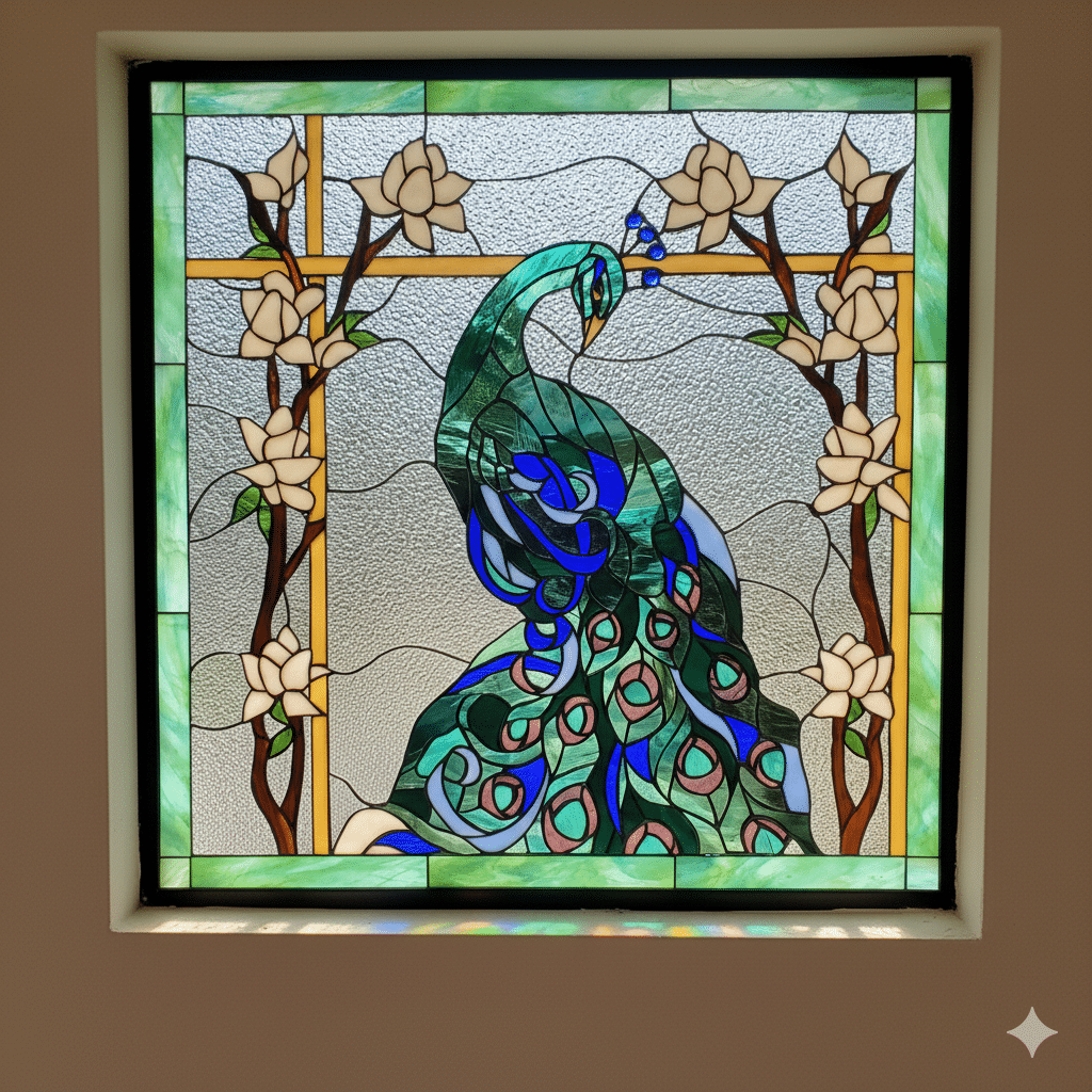With this leaded stained glass window panel, a handsome peacock preens his feathers amid blooming magnolia flowers. The frosted background glass makes it an ideal choice for letting light in without giving away privacy, making for an artful yet functional piece.