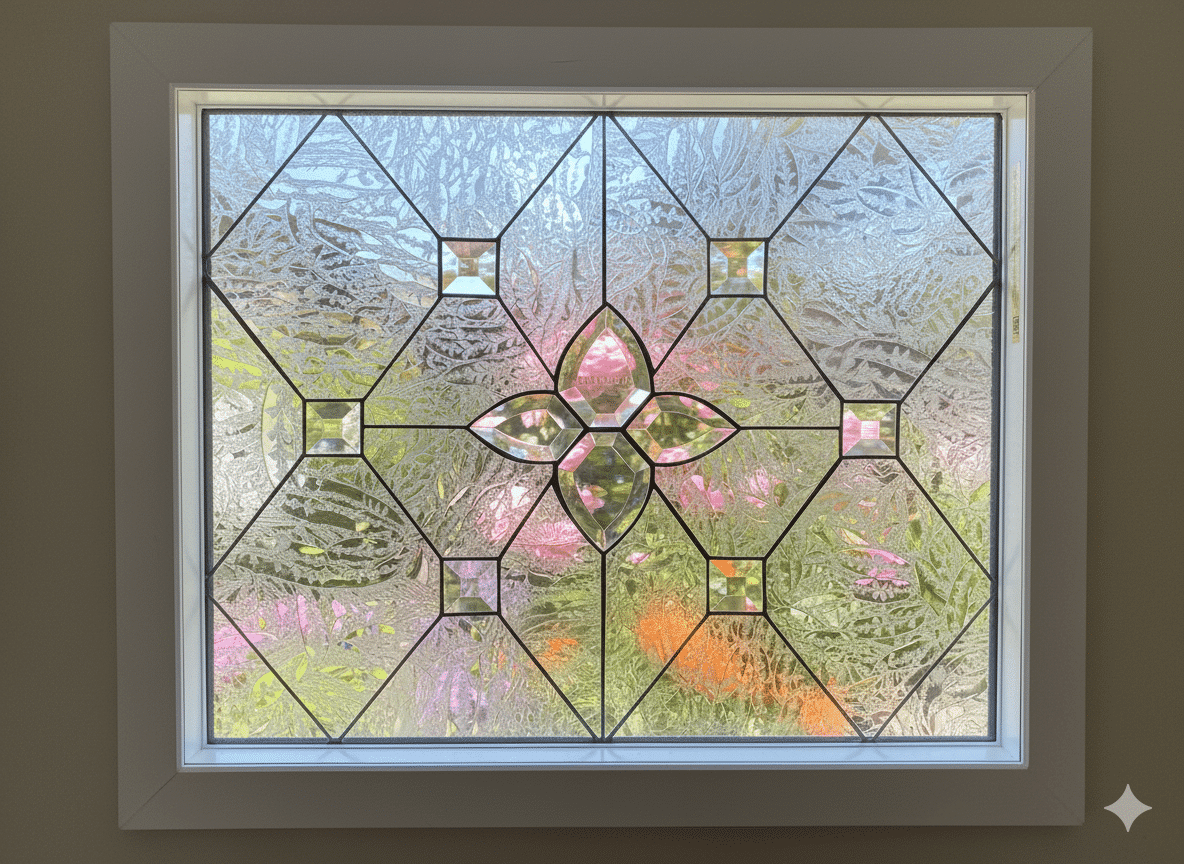 Add simple elegance to your home and enhance your views while maintaining privacy. Our Mountain View stained and beveled glass window is the perfect addition to any new home build or renovation. Insulated in tempered glass and framed in vinyl, it helps retain heat and cooling, keeping energy costs down while increasing style. The geometric design brings a modern touch, one that brings in light while obscuring what’s inside to those on the outside so you can enjoy the light without putting on a show in your master bath or suite, pool house, or any other space.