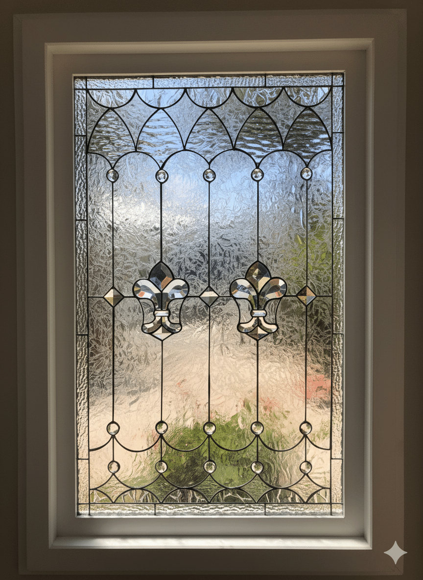 Add a regal design element to your home, one that nods to the classic styles with an eye on the future. Our Wildomar fleur de lis leaded stained glass window is vinyl framed and insulated to give you more than just a stunningly elegant design. It increases your energy efficiency with a triple-pane custom fit you can build into your new home or use to renovate an existing property. Add panache to your home’s style with the classic fleur de lis beauty, a timeless investment that will endure with absolute beauty in any room.