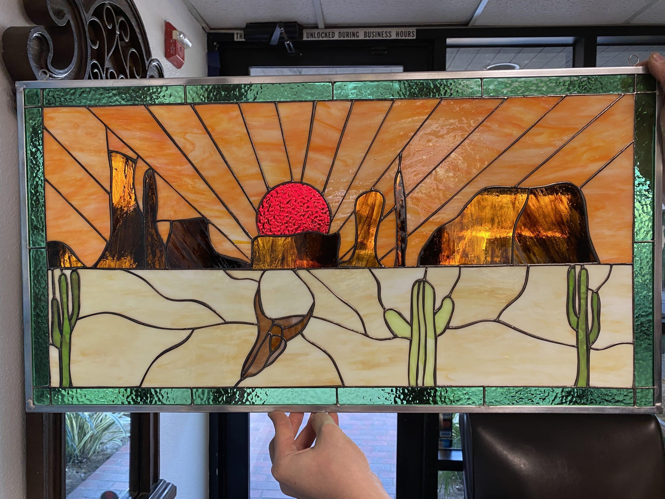 Live in the rugged southwestern setting every day. Our southwestern sunset and buttes stained glass window panel allows you to gaze fondly at the buttes dotting the landscape on the horizon while the red sunset burns down on the land. A cattle skull and cactus complete the desert imagery while the light from your windows creates a warming illumination through this dazzling scene.