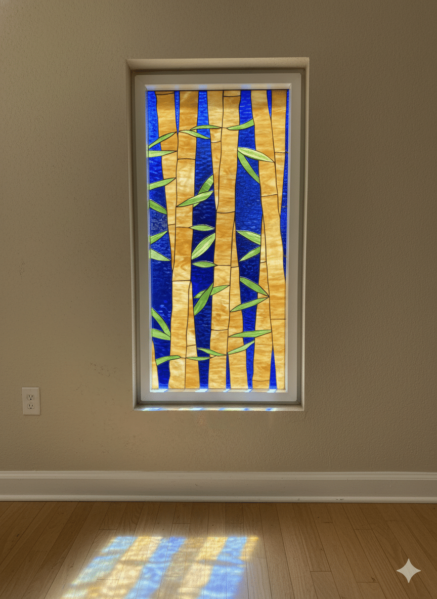 Stained Glass Bamboo & Deep Blue Sky Stained Glass Window Vinyl Framed, Insulated (Triple Paned)