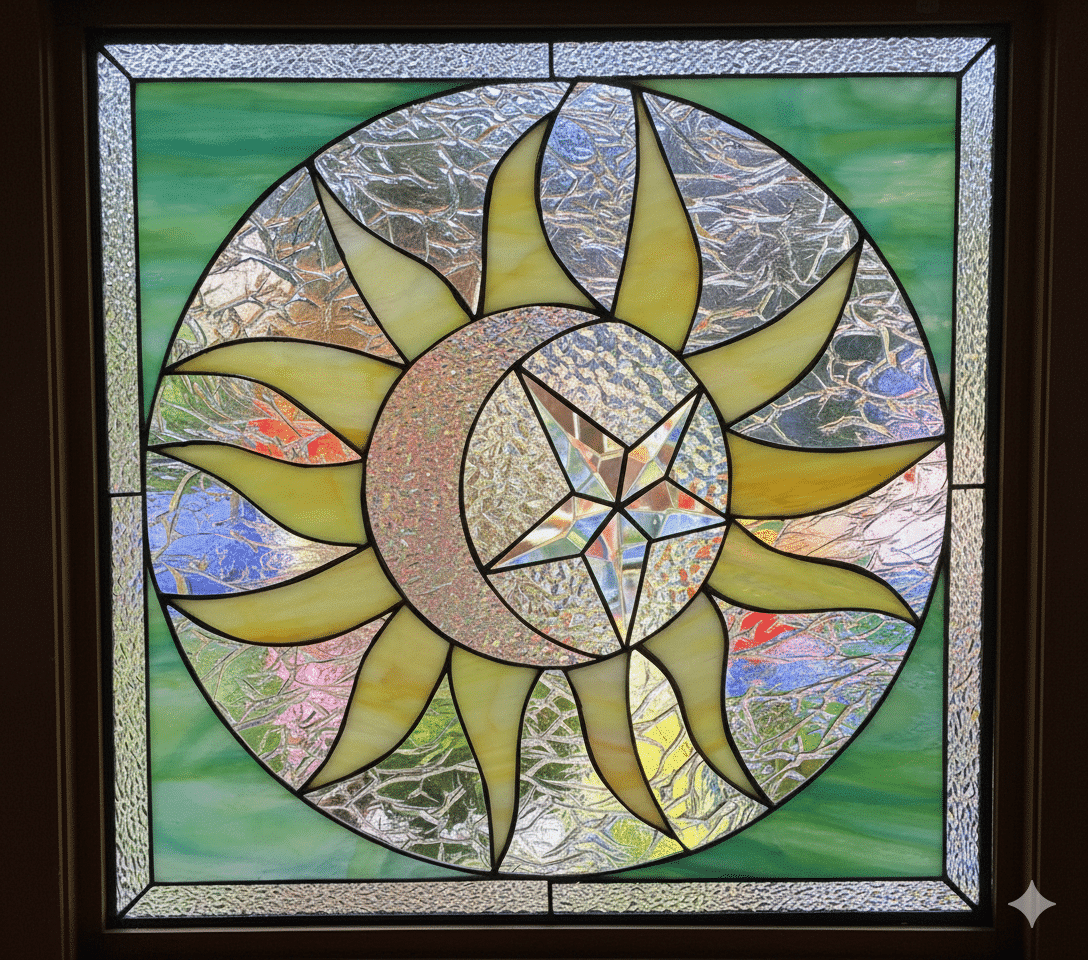Let the sun, moon, and stars be your guide with this beautiful beveled leaded stained glass window panel. Add an ethereal touch to your favorite nook or bedroom where the light from above shines on through, casting stunning hues throughout your space. Customize it to any size and see the sun, moon, and stars even on cloudy days and nights!