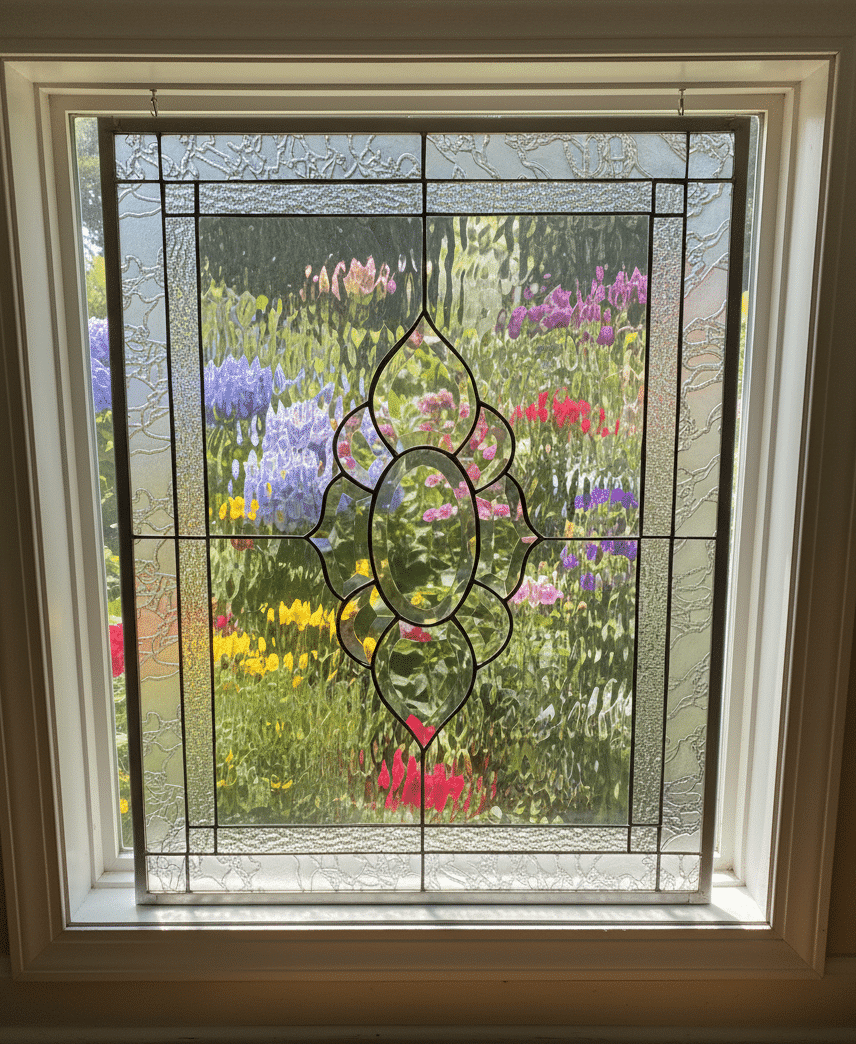 Here are the photos. The window really lights up the room, even when it’s a cloudy day. It’s just stunning! And we love how the textured glass sparkles when the sun shines through it.