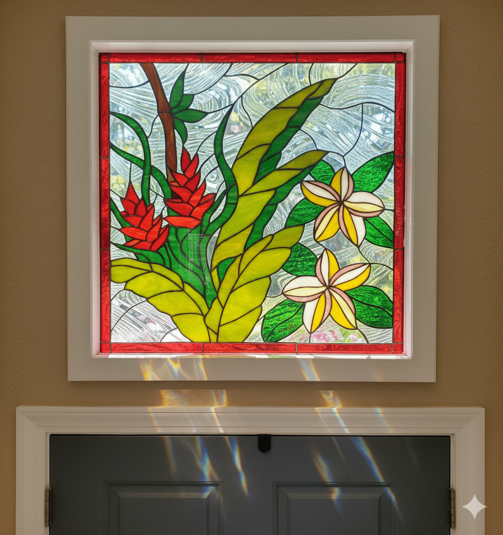 Our house builder installed our stained glass piece today! We love it! It’s perfect! I’ll send you some more photos another time when I can sort out the glare and there aren’t manufacturer stickers on the exterior window. (It’s separating a bathroom and a hallway, with an exterior window across from it to allow light into the bathroom.) But I wanted you to see it ASAP. Thank you so much!!!!! We are thrilled! It couldn’t be better!
