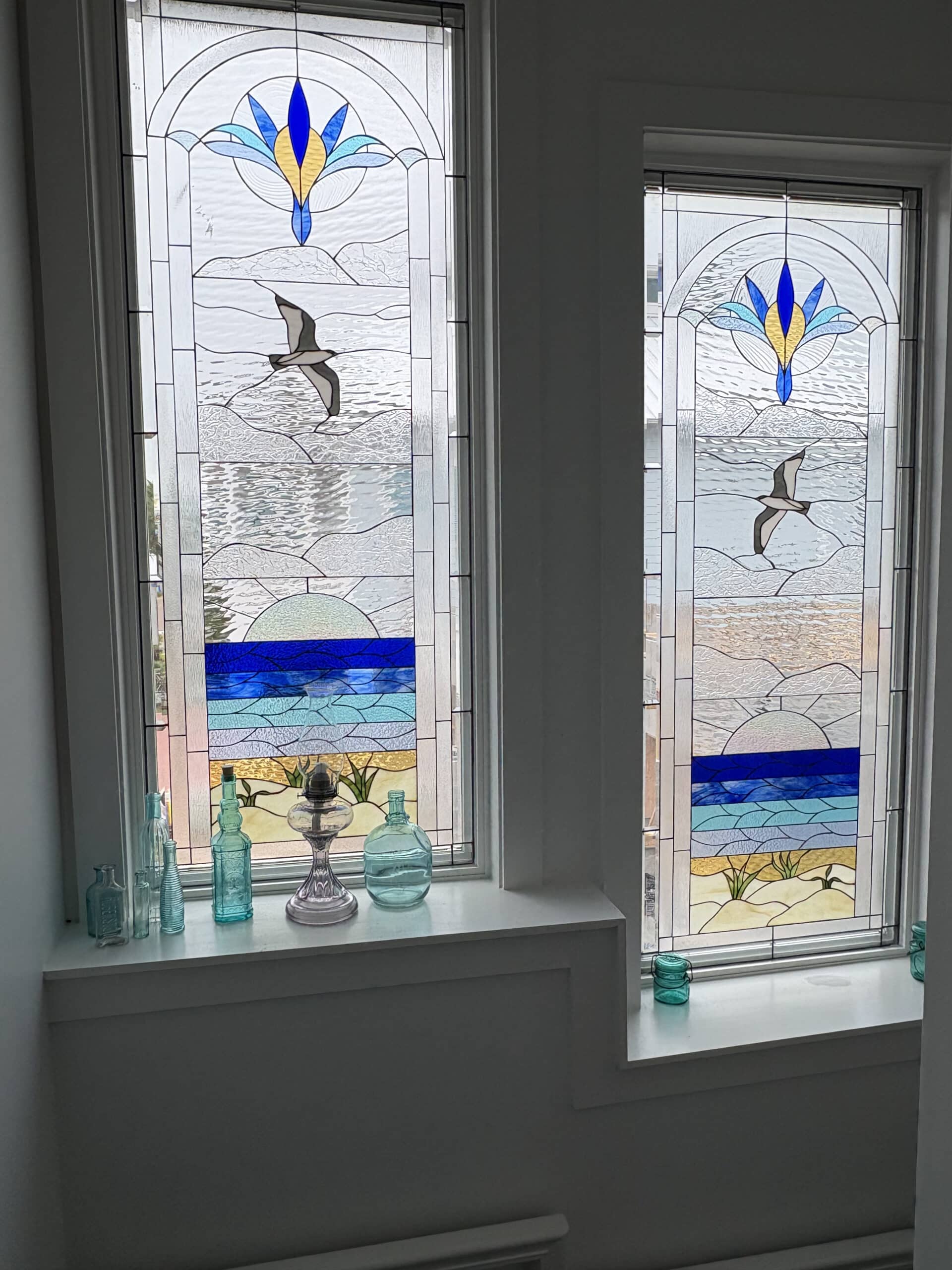 A standout centerpiece is the set of tall, vertical panels showcasing a vibrant coastal scene complete with soaring seagulls, a